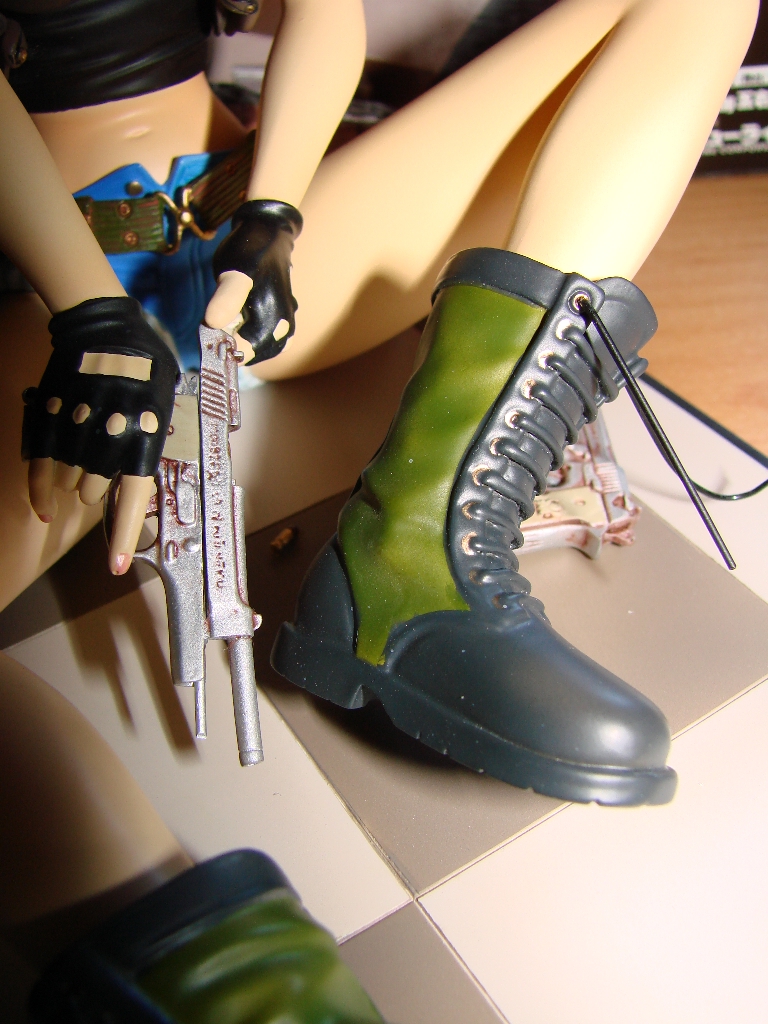 Auf jeden Fall hätte ich nicht gedacht eine Statue von dieser Serie zu kaufen. Als ich jedoch damals das Promotion Bild der Resin-Statue von Revy sah war ich einfach nur begeistert. Sie sah nicht nur wirklich auch wie Revy aus (die PVC-Varianten sahen ja scheußlich aus), sondern es stimmt einfach alles. Die Pose passt sehr gut, die Base ebenfalls passend, die “Dekorations”-gegenstände (Munitionen und Waffe) sind nur noch das Pünktchen auf dem “i”.