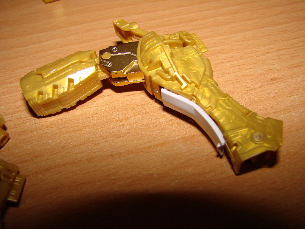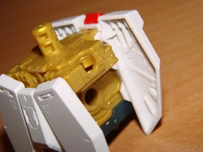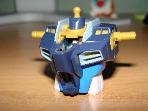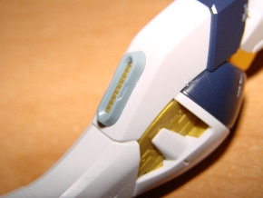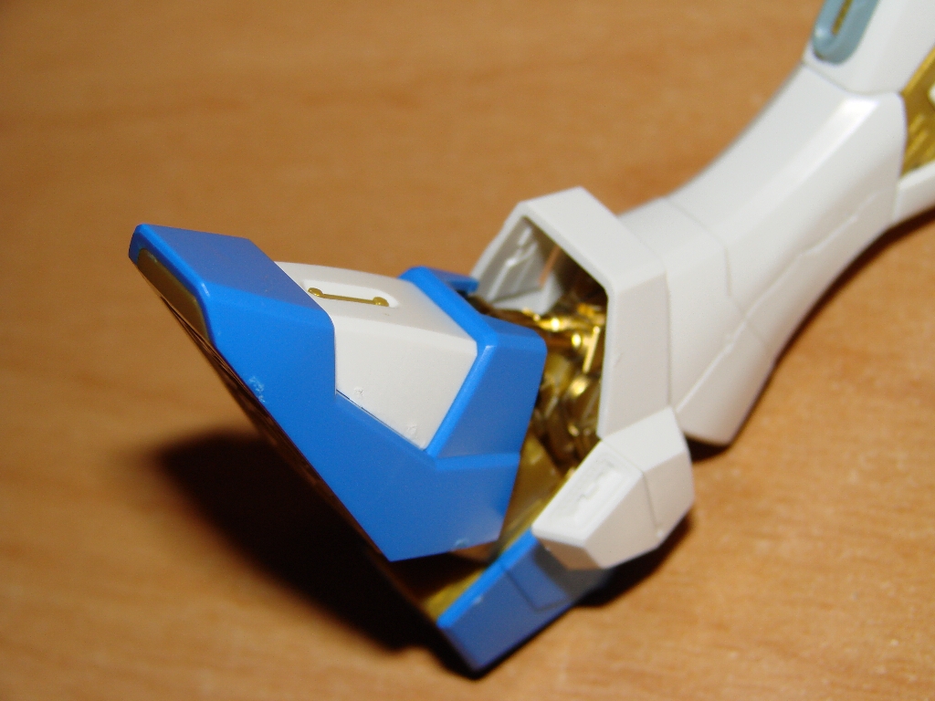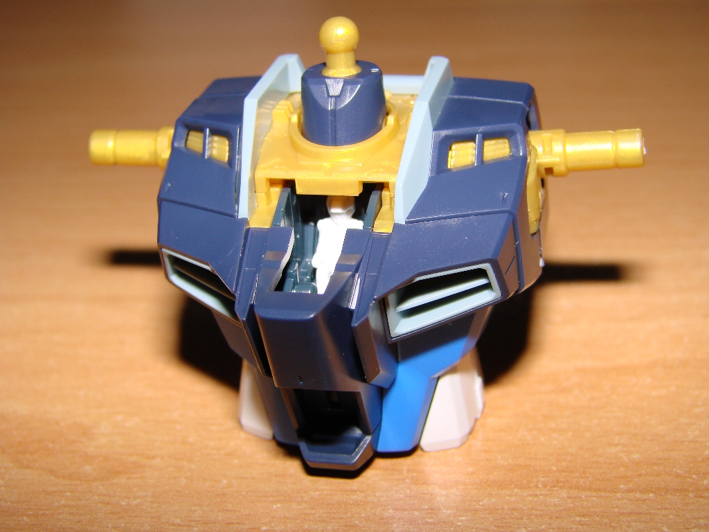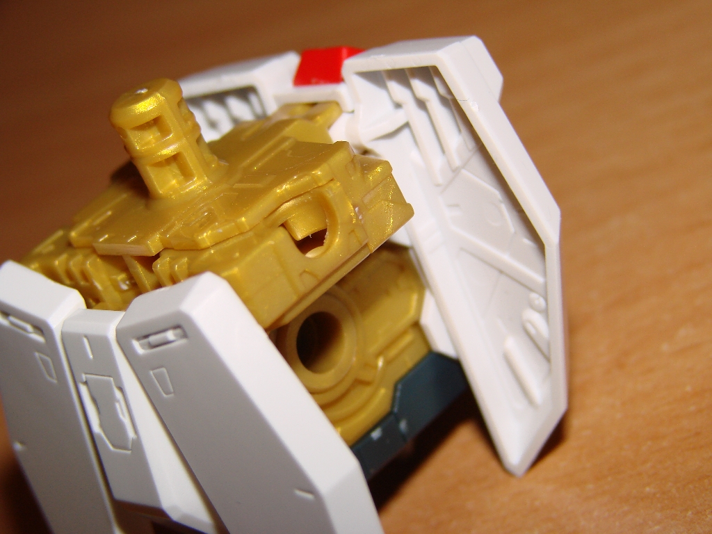 Beim Kopf gab’s eigentlich keine Schwierigkeiten, Easy-Going. Die einzigste Fitzelarbeit waren die Aufkleber für die Auge, jedoch vorallem die kleinen blauen Aufkleber über dem roten Dreieck. An den Seiten sieht man hier auch zum ersten Mal die Anwendung der Goldteile die speziell im “Full Burst Mode”-Kit enthalten sind.