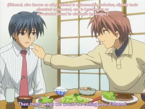 Ethanol…ähm…Tomoya selbst hat ein eher schwieriges Familienleben. Nach dem Tod seiner Mutter verfiel sein vater dem Alkohol und Glücksspiel.