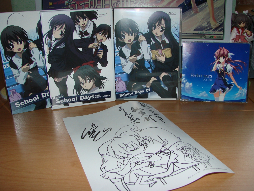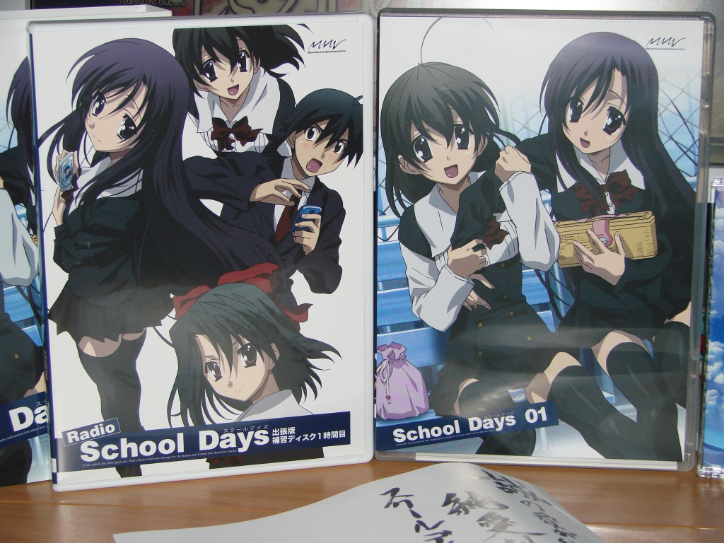 Das Ende von School Days hat mir wirklich so gut gefallen, dass ich beschlossen habe die DVDs zu sammeln und natürlich am besten in der Limited Edition. Die Limited Edition beinhaltet neben einer CD mit Radio-Drama, ein nettes Sheet mit Illustration von Itou, Sekai und Katsura wie auch ein School Days Poster(gerollt und nicht gefaltet, perfekt!). Was auf dem Poster abgebildet ist kann ich nicht sagen, da ich es bisher nicht entrollt habe und eigentlich auch nicht vorhabe, da ich sowieso keinen Platz mehr für ein Poster an der Wand habe. Das Radio-Drama muss ich mir auch erst noch anhören, da es mit einer Länge von 57min nicht gerade mal schnell angehört ist.