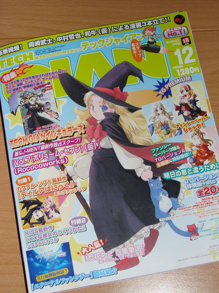Dieses Magazin zählt seit einiger Zeit schon zu meinen Must-Buys auch wenn ich jetzt nicht so übermäßigen Konsum an Galge oder gar Eroge habe. TECH GIAN ist wie ich finde, dass einzigste auf Galge und Eroge orientierte Magazin in Japan mit einer guten DVD in jeder Ausgabe. Die DVD enthält dabei die Opening- oder Promo-Videos zu aktuellen Galge/Eroge und ich persönlich liebe es diese Openings immer und immer wieder anzusehen und dabei ist es natürlich wirllich sehr vorteilhaft, wenn diese Videos in DVD-Qualität vorliegen und ganz einfach in den DVD-Player geschmissen werden können.