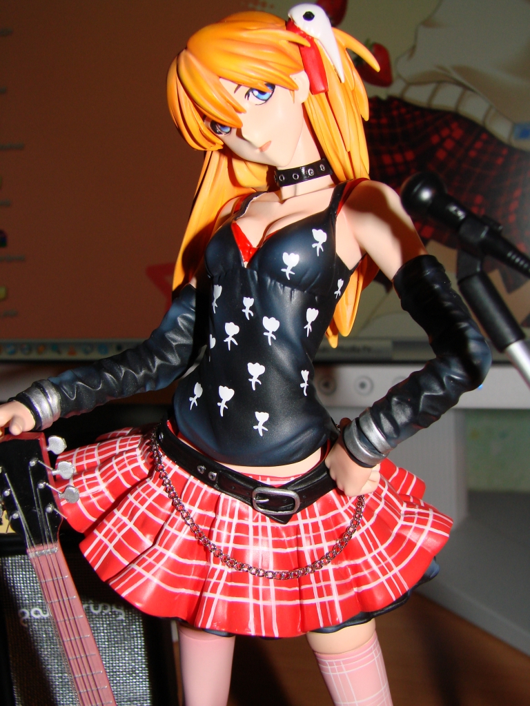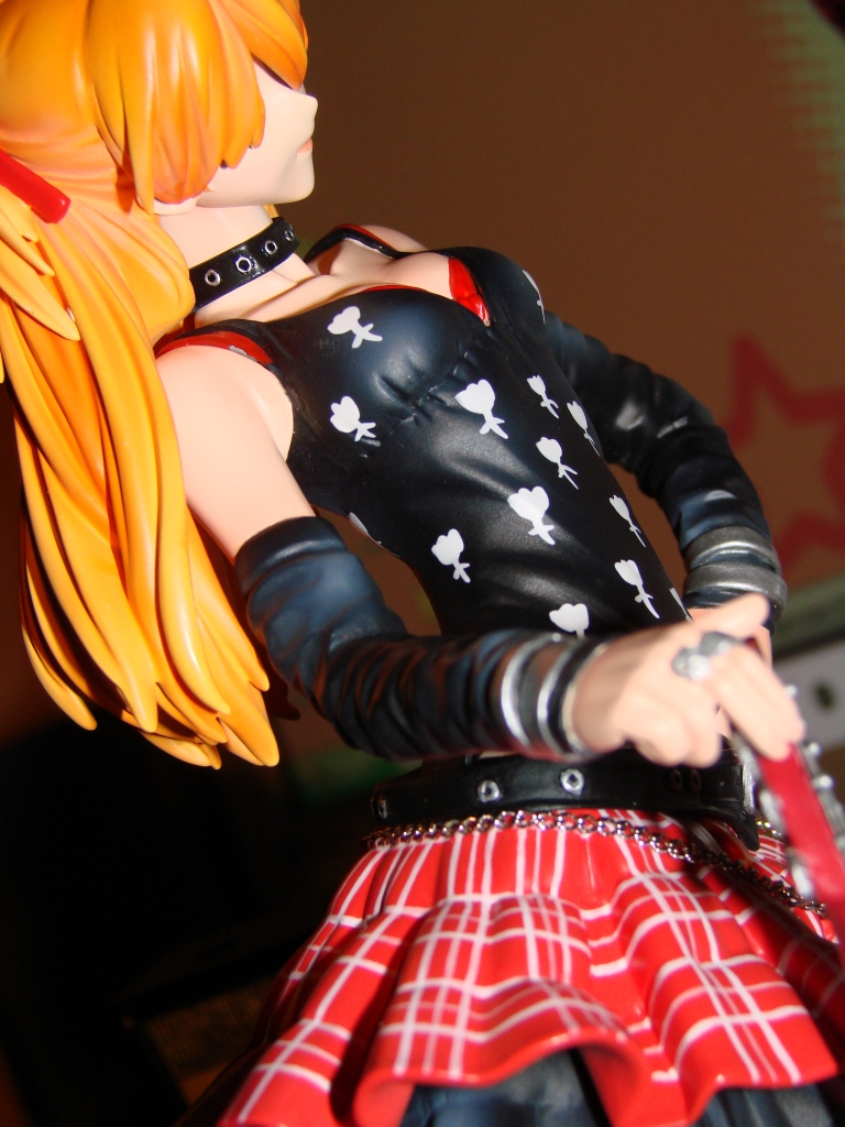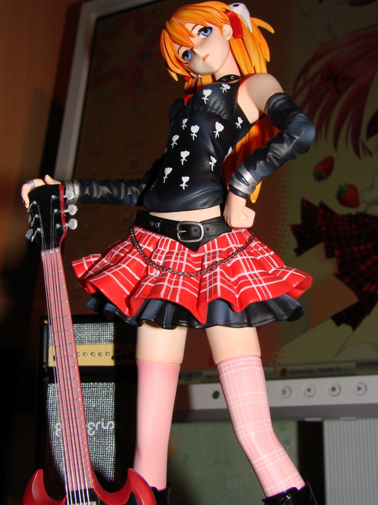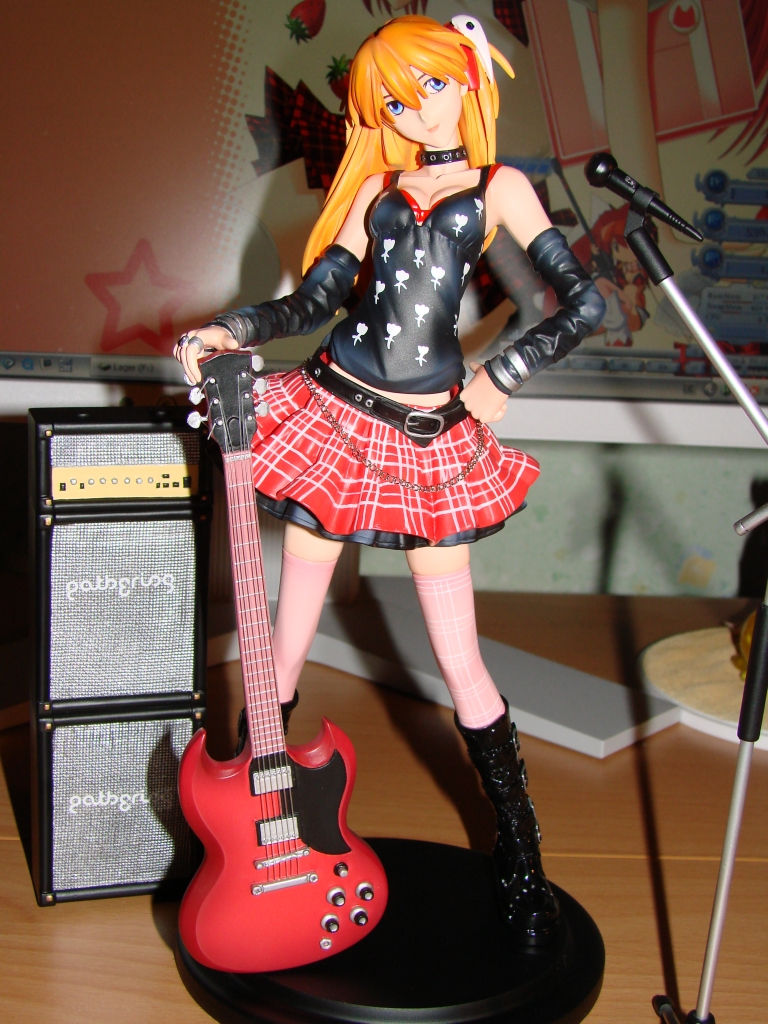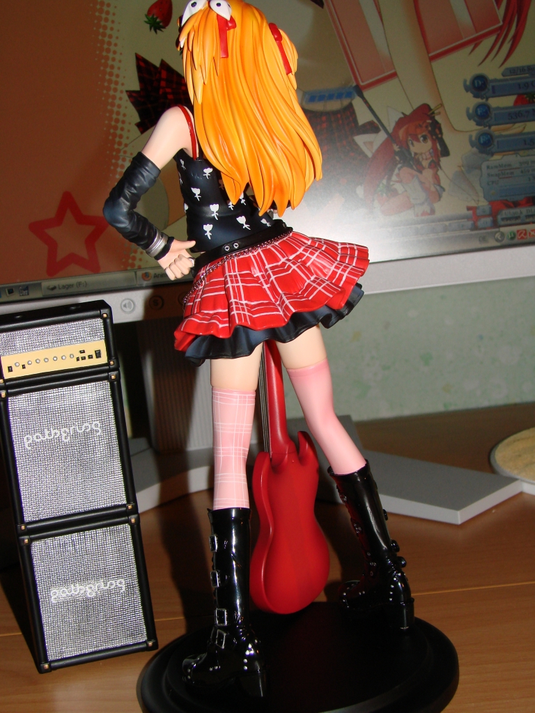 Nun aber zum neusten Erwerb und somit zum neusten Stück meiner Sammlung. Asuka dürfte wohl jedem aus NGE bekannt sein, jedoch dürfte die rockige Kit Variante eine Seite an ihr sein die wohl noch niemand so gesehen hat. Das Outfit und die Gitarre stehen Asuka ausgesprochen gut und passen auch wirklich zum Charakter. Die Arbeit ist mal wieder zufriedenstellend von E2046 ausgeführt worden und meckern kann ich dieses Mal auch nur eher wenig. Jedoch leistete sich E2046 dieses Mal einen Schnitzer bei der Bemalung des Lautsprechers, welchen ich ganz unten in diesem Review aufführen werde. Ansonsten ist die Bemalung wirklich wieder einwandfrei gelungen.