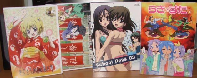 Und monatlich grüßen die japanischen Must-Buy DVDs der drei Serien Higurashi Kai, School Days und Lucky Star. Diese Lieferung erreichte mich glücklicherweise etwas schneller und somit noch vor den ganzen Feiertagen womit sowieso wieder jede kleine Lieferung mal wieder Ewigkeiten länger braucht um anzukommen. Diese hat es von vielen geschafft trotz des vielen Verkehrs noch anzukommen und deswegen gibt’s an dieser Stelle wieder ein “Shopping aktuell”. ^^