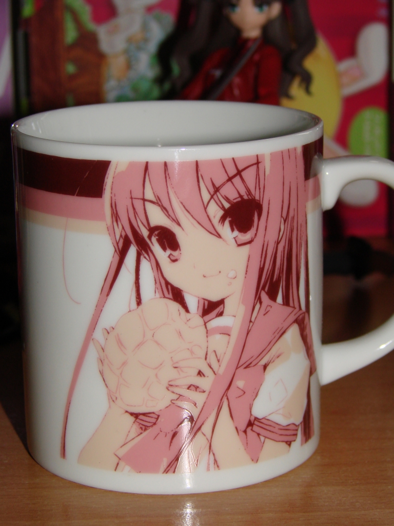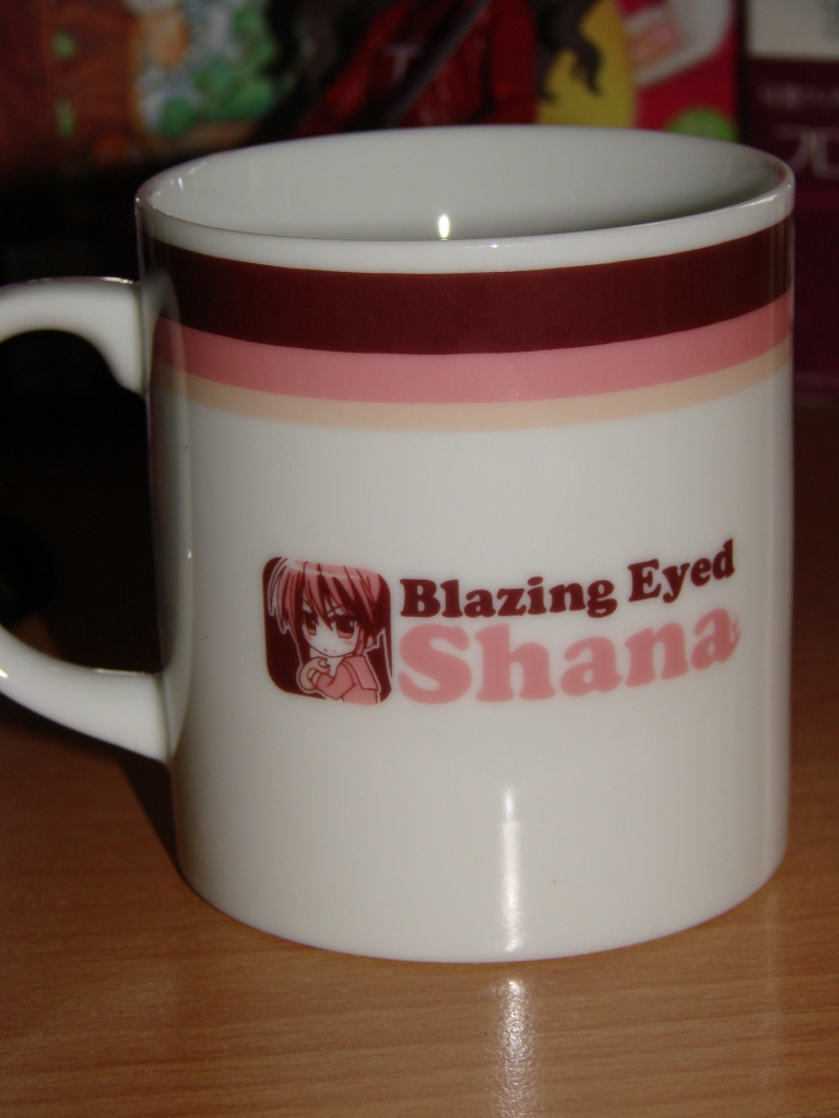 Perfekt für den Start in den Morgen, die Shana Tasse. Eignet sich auch wunderbar um sie einfach nur ein paar Stunden anzustarren. Im ernst, mir gefällt die Tasse wunderbar. Das Motiv ist einfach toll mit der Melonpan knabbernden Shana. Einzigster Wermutstropfen an dieser ansonsten tollen Tasse ist, dass sie kleiner ausfällt als eine normale Kaffeetasse. Vorallem schlimm wenn man bedenkt, dass man für die größere Saber Tasse den selben Preis hinlegt.