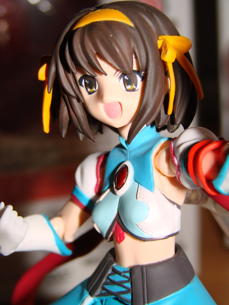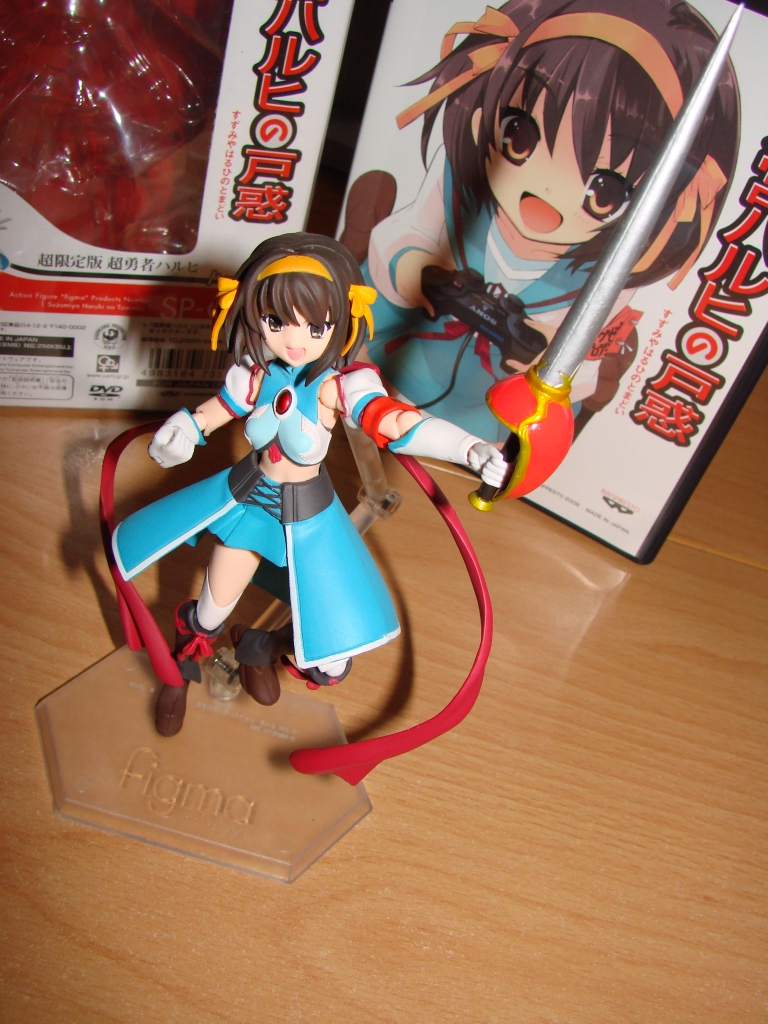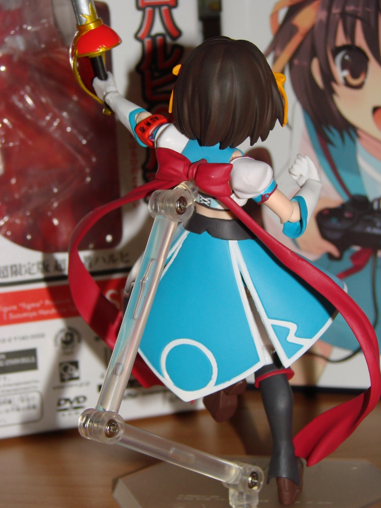 Und hier nun das Extra der LE, die Haruhi Figma. Ich persönlich bin eigentlich überhaupt kein Fan von Gelenkfiguren, aber zumindest die revoltech wie auch die Figma Reihe sagen mir ganz gut zu. Mir gefällt die RPG Fassung von Haruhi sehr gut. Schön verarbeitet und beamlt, auch wenn bei der Brosche etwas geschlampt wurde. Zusätzlich enthalten sind noch optionale Hände wie auch ein optionales Gesicht zum Wechseln.