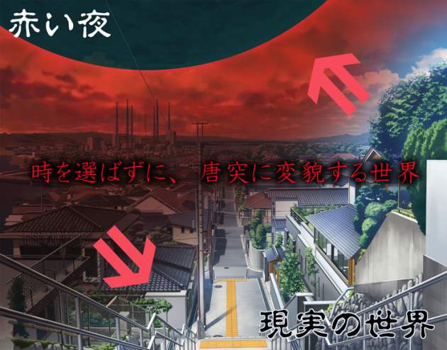 Die Welt von 11eyes teilt sich grob in zwei Bereiche auf. Die normale Welt wie wir sie kennen und in welcher die Hauptprotagonisten ihrem alltäglichen Leben nachgehen. Das Phänomen der 赤い夜 (Romaji: akai yoru; Roten Nacht), eine Welt in welcher alle Menschen plötzlich verschwinden.