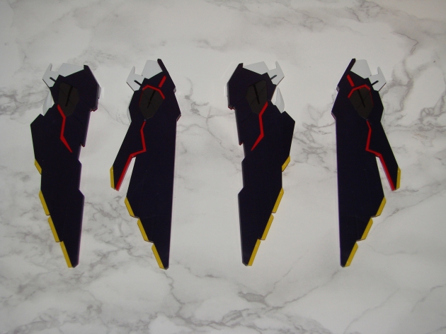 Kommen wir zu den Waffen. Größtenteils möchte ich diese auch noch ein wenig mit Farbe aufwerten, dass bisher einzigste was ich daran gemacht habe sind die zu sehenden schwarzen Stellen und Konturen. Kommen wir zu den Waffen von links nach rechts: Beam Zanber, Buster Gun, Muramasa Blaster und zuletzt die Beams des Brand Marker, welche an einem Armteil des Gundams befestigt werden können.