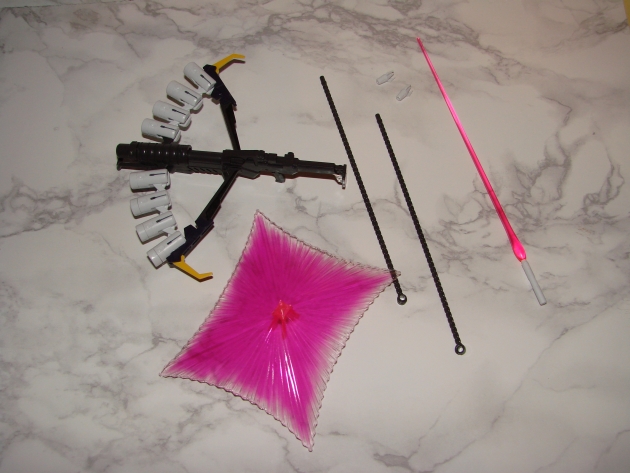 Hier nun zum einen der Peacock Smasher (Armbrust), das Beam Shield, zwei Screw Whips mit Aufsatz und zu guter Letzt eines der Beiden Beam Saber. Ansonsten scheine ich die Heat Daggers vergessen zu haben zu knipsen, aus dem einfachen Grund, dass diese im Gundam selbst integriert waren. Bilder gibt zu den Heat Daggers trotzdem noch. ^^