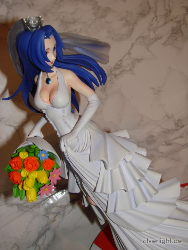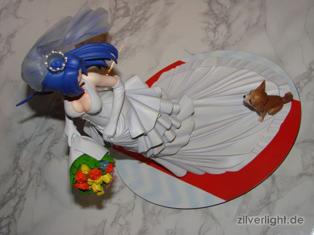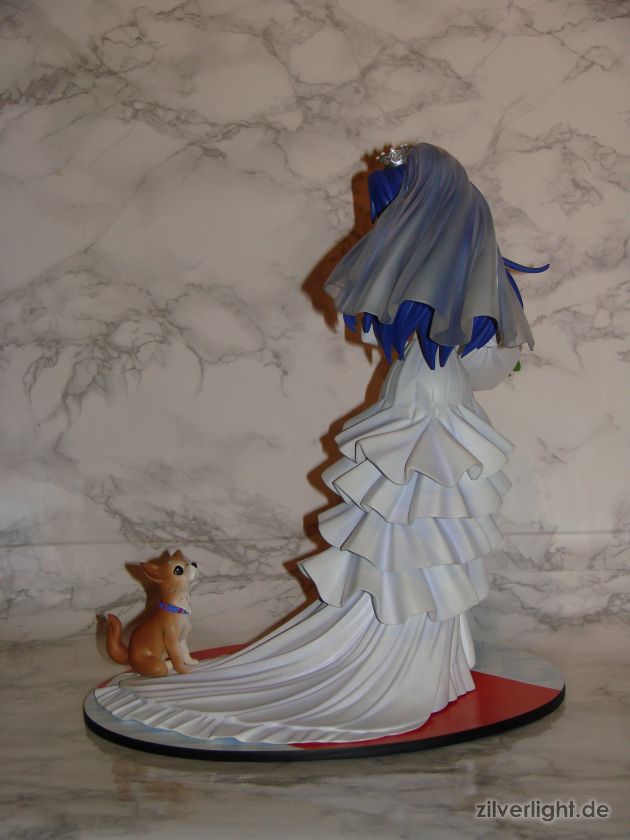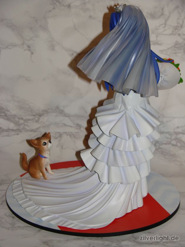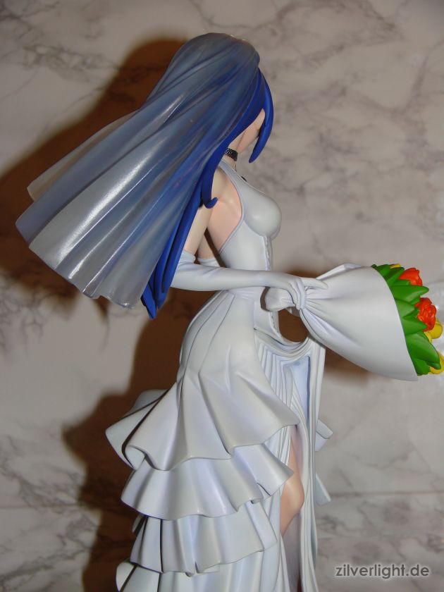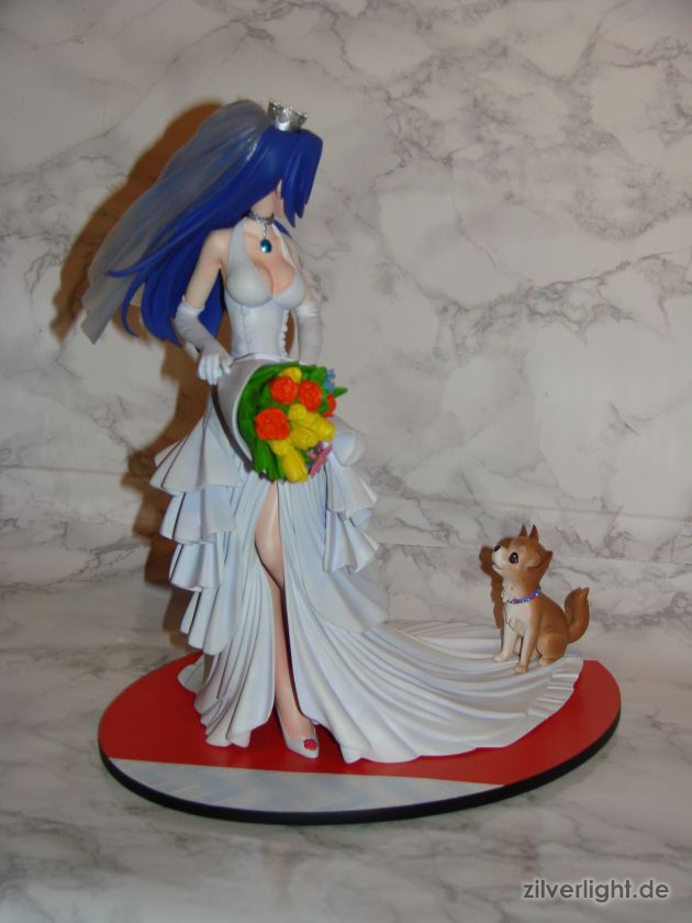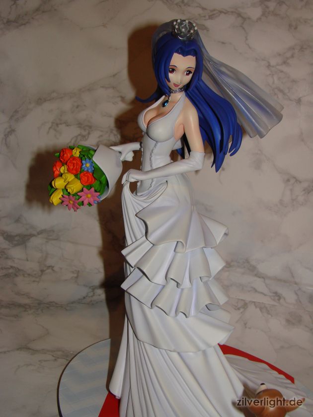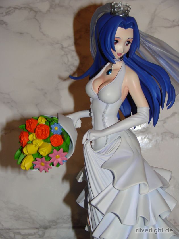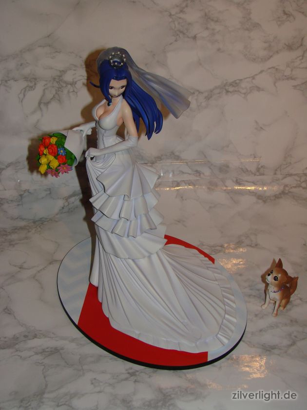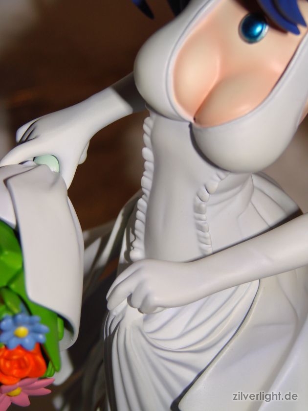 Insgesamt bin ich mal wieder sehr zufrieden mit der Arbeit von E2046. Umsetzung sieht wirklich sehr gut aus und die Details wurden ebenfalls schön herausgearbeitet. Die Bemalung ist ebenfalls sehr ansehnlich geworden, vorallem mit den Schattierungen im Hochzeitskleid. Allerdings habe ich bei der Bemalung als einzigstes an diesem Kit etwas auszusetzen bzw. einen Verbesserungswunsch gehabt. Im ganzen gesehen sieht die Bemalung wunderbar aus, jedoch hätte ich mir bei den Schattierungen vom Hochzeitskleidviel eher einen etwas stärkeren feinen violetten Ton gewünscht, also genau so wie man es vom Promobild der GSC-Statue kennt. Das sehr leichte violett, welches auf meinen Bildern schon fast hellblau wirkt, harmoniert zwar ebenfalls ganz gut mit der Statue, allerdings macht es die Statue zugleich etwas dumpfer im Gesamteindruck und setzt die Statue in der Optik etwas herab. Ein stärkeres violett hätte hier ein gewisses strahlen verliehen und das Hochzeitskleid besser ins Licht gerückt. Als weiteren Punkt hätte ich mir vielleicht noch leichte Schattierungen an den Blumen gewünscht. Die Base ist ebenfalls sehr gut gelungen und wurde an das Hochzeitsthema der Statue angepasst. Die Statue wird an der Base mit einer einzigen Steckverbindung festgehalten. So wirklich traue ich dieser einen Steckverbindung an ihrem Fuss noch nicht, aber scheint anständig zu halten.