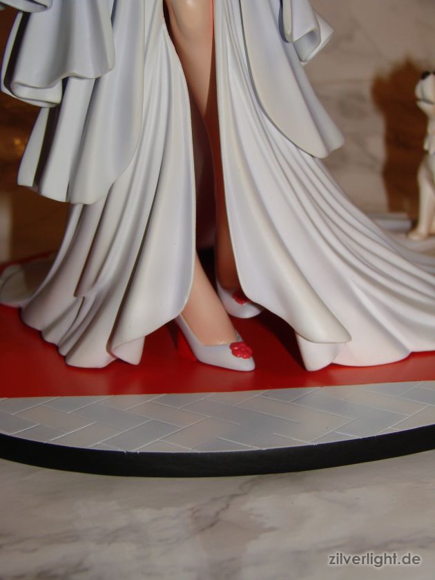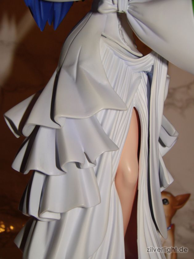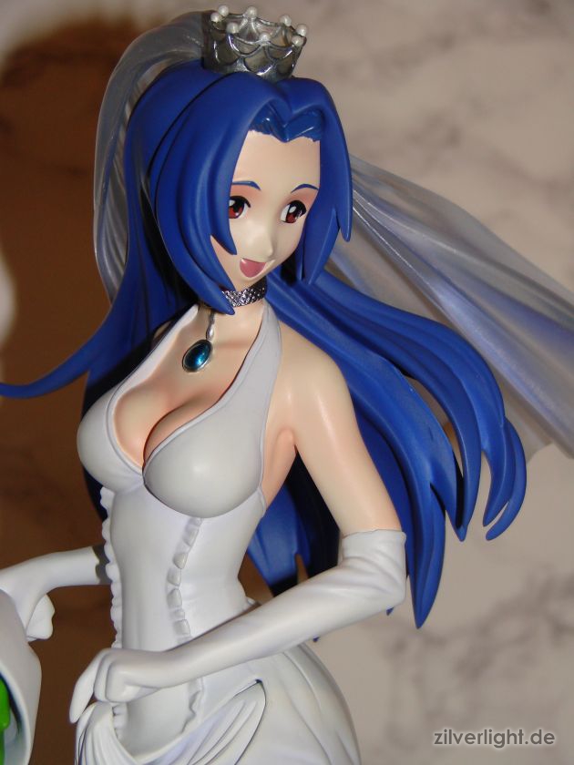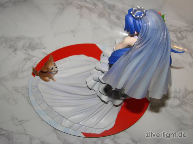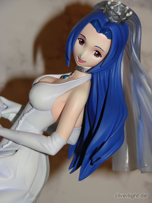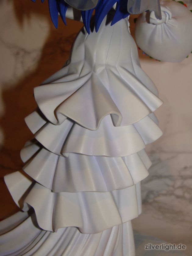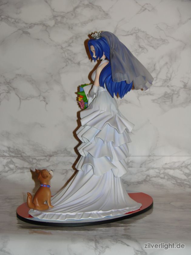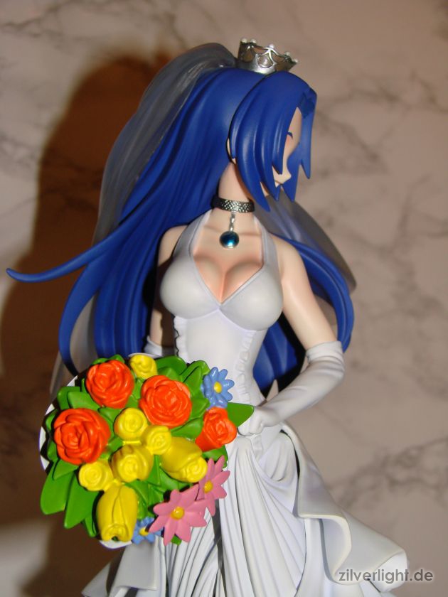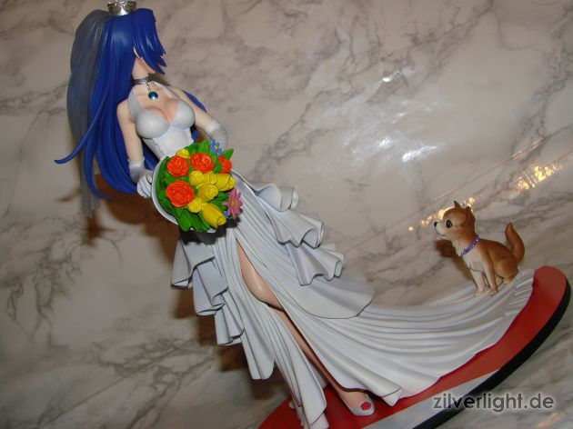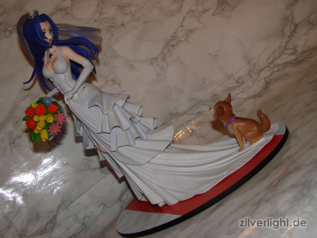 Insgesamt bin ich mal wieder sehr zufrieden mit der Arbeit von E2046. Umsetzung sieht wirklich sehr gut aus und die Details wurden ebenfalls schön herausgearbeitet. Die Bemalung ist ebenfalls sehr ansehnlich geworden, vorallem mit den Schattierungen im Hochzeitskleid. Allerdings habe ich bei der Bemalung als einzigstes an diesem Kit etwas auszusetzen bzw. einen Verbesserungswunsch gehabt. Im ganzen gesehen sieht die Bemalung wunderbar aus, jedoch hätte ich mir bei den Schattierungen vom Hochzeitskleidviel eher einen etwas stärkeren feinen violetten Ton gewünscht, also genau so wie man es vom Promobild der GSC-Statue kennt. Das sehr leichte violett, welches auf meinen Bildern schon fast hellblau wirkt, harmoniert zwar ebenfalls ganz gut mit der Statue, allerdings macht es die Statue zugleich etwas dumpfer im Gesamteindruck und setzt die Statue in der Optik etwas herab. Ein stärkeres violett hätte hier ein gewisses strahlen verliehen und das Hochzeitskleid besser ins Licht gerückt. Als weiteren Punkt hätte ich mir vielleicht noch leichte Schattierungen an den Blumen gewünscht. Die Base ist ebenfalls sehr gut gelungen und wurde an das Hochzeitsthema der Statue angepasst. Die Statue wird an der Base mit einer einzigen Steckverbindung festgehalten. So wirklich traue ich dieser einen Steckverbindung an ihrem Fuss noch nicht, aber scheint anständig zu halten.