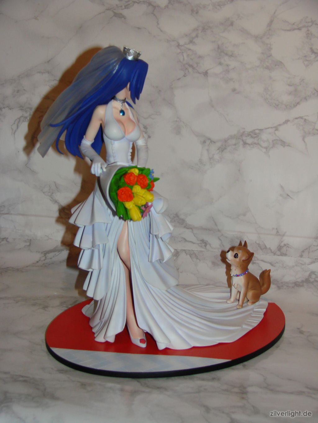 Wandern wir nun zur Fotostrecke weiter. Hierbei muss ich noch anmerken, dass an der Statue leider noch eine Haarsträhne, das Band am Blumenstrauß und der Brief im Mund des Hundes fehlte als ich die Fotos geschossen hatte. E2046 hatte die wirklich gut im Karton versteckt und mir ist das leider erst am Ende so wirklich aufgefallen als ich nochmal überlegte “sag mal, da fehlt doch was”. Schande über mein Haupt, aber die Statue sieht auch so sehr fein aus. Ansonsten Licht mal wieder so eine Sache bei den Bildern, so langsam sollte ich ernsthaft über ein kleines Lichtstudio nachdenken…wenn ich den Platz zum Aufbewahren noch hätte. ^^”