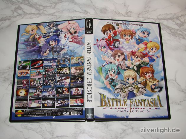Ich mag diese Doujin Video-Reihe irgendwie und daher musste “Chronicle” vom Comiket 74 natürlich auch her. Diese neue DVD beinhaltet einige ältere Videos und zusätzlich noch eine Vorschau auf das neueste Battle Fantasia. Die Videos von BF sind dabei wie die typischen Kampfszenen von SRW (Super Robot Taisen/Super Robot Wars) aufgebaut. Hierbei werden Anime, Manga oder andere beliebte Charaktere eingesetzt. Ich besitze bereits die W-DVD, welche ihr in diesem älteren Beitrag sehen könnt. Ansonsten gibt es hier mal einige Videos zu Battle Fantasia: