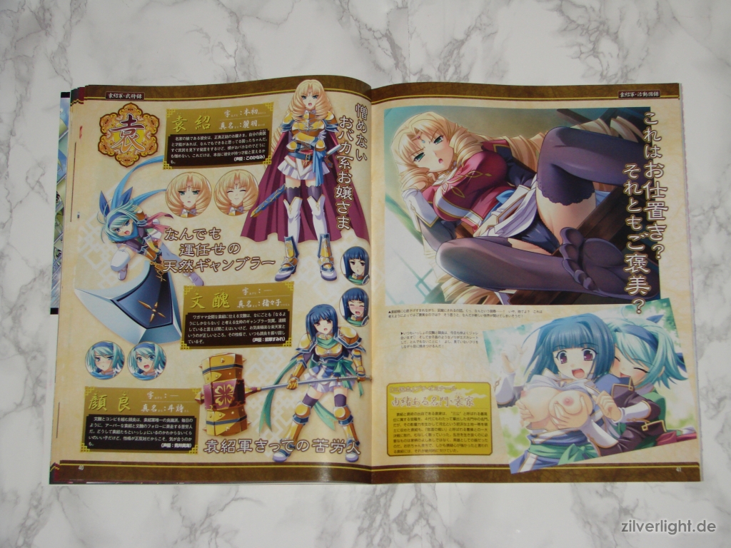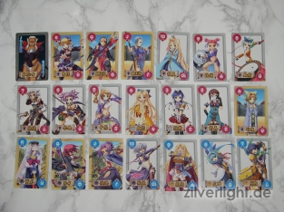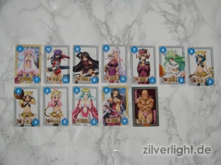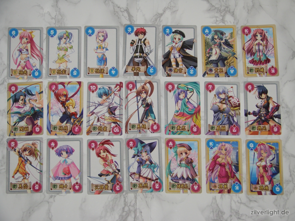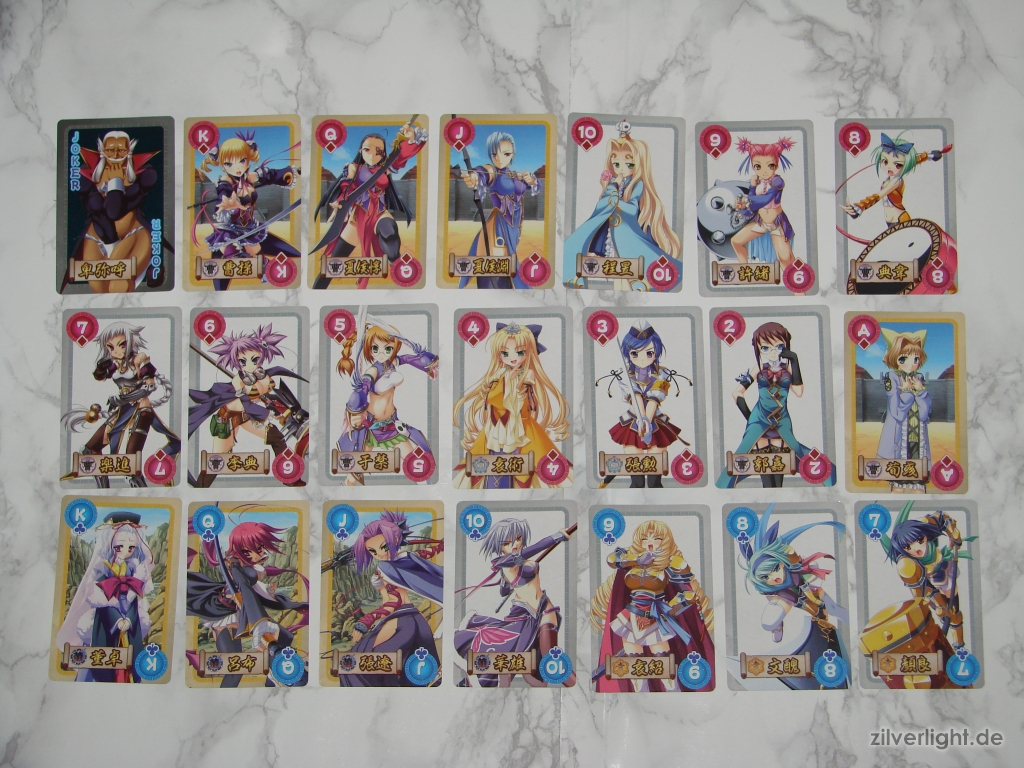 Kartenspiel mit 54 Spielkarten auf welchen wohl sogut wie alle Charaktere von Shin Koihime Musou abgebildet sind. Persönlich sind meine bishoujo Favoriten Ryofu Housen (1.Bild, 3.Reihe, 2.Karte von links), die beiden jüngsten Schwestern von Sonsaku Hakufu aus dem Königreich Wu, genannt Sonken Chuubou (2.Bild, 3.Reihe, 1.Karte von rechts) und Sonshoukou (3.Bild, 1.Reihe, 1.Karte von links), wie auch Shūtai Yōpei (3.Bild, 1.Reihe, 3.Karte von links) ebenfalls vom Königreich Wu. Ansonsten könnte ich auf all die anderen Charaktere fast schon verzichten, wenn ich diese vier im Harem hätte. Sofern ich Shin Koihime Musou mal in Angriff nehme, werde ich wohl mit ziemlicher Sicherheit mit der Wu Route anfangen. XD