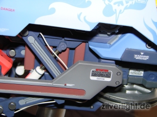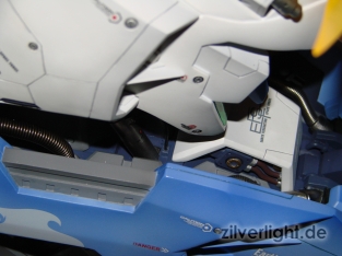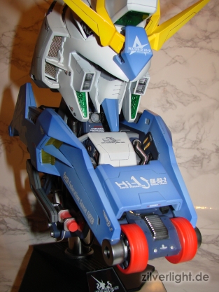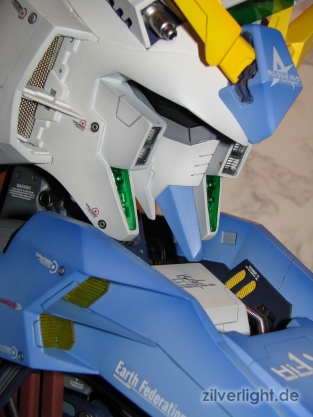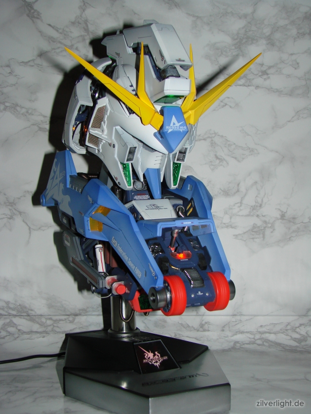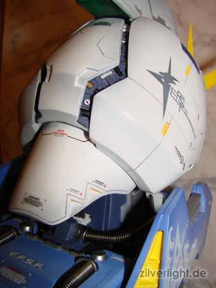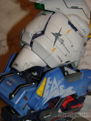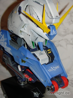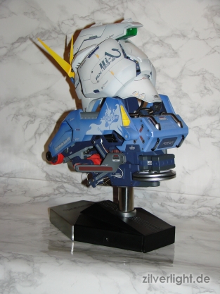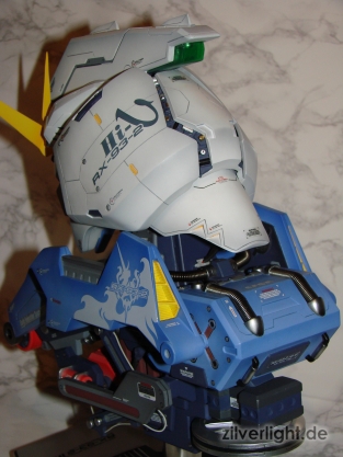 Zuerst zur Umsetzung des Mecha. Das Kit ist im Vergleich zum Original wirklich sehr gut umgesetzt worden. Was die Farbe angeht ist soweit alles sehr schön gestaltet und die Farben passen soweit. Bei dieser Büste hat man sich auf eine Variante des RX-93-2 verlassen, denn der originale RX-93-2, bekannt aus dem Novel “Beltorchika’s Children”, besitzt ein weisses V-Zeichen. Ansonsten ist auch das blau der Büste etwas farbschwacher als im Original, was mir jetzt persönlich sogar richtig gut gefällt auch wenn ich gegen ein kräftigeres blau nichts gehabt hätte. Die Bemalung ist wirklich bis ins letzte Detail feinsäuberlich ausgeführt worden. Absolut perfekt würde ich sagen. Wenn wir beim Detail sind kommen wir doch im nächsten Punkt sofort auf die Markings bzw. Decals zu sprechen. Jegliche Decals sind ebenfalls sauber aufgetragen worden und es finden sich keinerlei Knicke oder Runzeln. Zur Anordnung der Decals. Diese wurden wirklich großzügig aufgetragen und so finden sich typische “Caution” und “Danger” Markings wie man das auch schon von den Designs von Hajime Katoki, dem Designing Gott von Gundam (ich liebe seine Versionen auf jeden Fall), kennt und liebt. Ansonsten sind größere Decals passend angebracht worden.