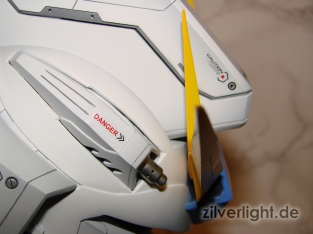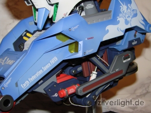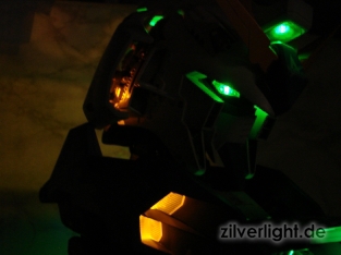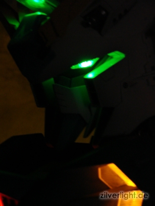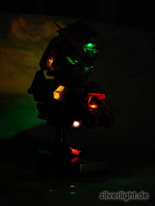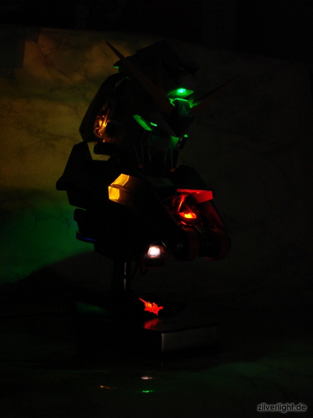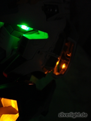 Es werde Licht! Minovsky Partikel volle Kraft! Leider fehlte mir um das Lichtfeature sehr gut darstellen zu können ein Lichtdimmer oder zumindest irgendeine Konstruktion um das Licht “manuell” zu dimmen. So blieb mir nur die Wahl das Licht komplett auszuschalten. Dadurch ist das Licht des RX-93-2 zwar sehr gut ersichtlich, aber der Rest des Gundams ist leider eher in Dunkelheit gehüllt.