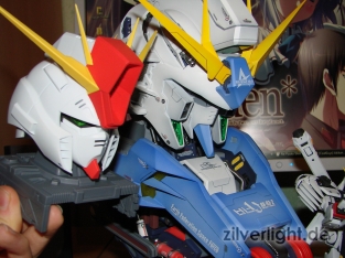 Ich kann nur sagen ich bin absolut beeindruckt von diesem Kit und ich bereue den Kauf kein Stück. Die Optik ist durch die einwandfreie Verarbeitung wunderschön und das Größenverhältnis von 1/24, was einer Höhe von etwa 33cm entspricht, ist mehr als ausreichend, damit das Kit alleine ausgestellt Blicke auf sich ziehen kann auch ohne aktivierte Funktionen. Die Funktionen setzen dem Ganzen meiner Ansicht nach nur noch ein Sahnehäubchen auf, denn persönlich werde ich diese wohl ohnehin nur sehr selten aktivieren. Momentan habe ich nur eine Sache die ich etwas schade an dem Kit finde und das ist, dass es nur einen Power-Button gibt der alle Funktionen aktiviert. Ich hätte es viel schöner gefunden, wenn es zwei separate Power-Buttons gegeben hätte, womit man zum einen die Beleuchtung und zum Anderen die mechanischen Bewegungen nach belieben ein-/ausschalten hätte können. Die mechanischen Bewegungen sind zwar schön, aber Bewegungsmotoren sind nunmal nicht leise und das stört mich dann wiederum doch etwas. Aktuell liebäugle ich daher auch noch mit der Strike Gundam Evolve8 Büste, welche nur Lichtfunktionen besitzt.