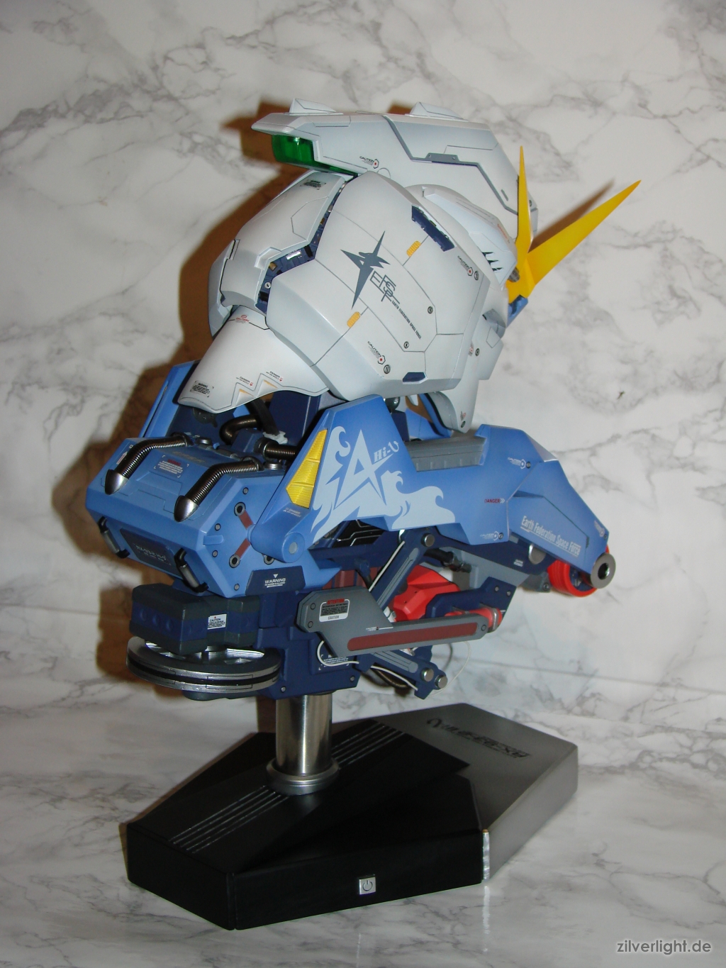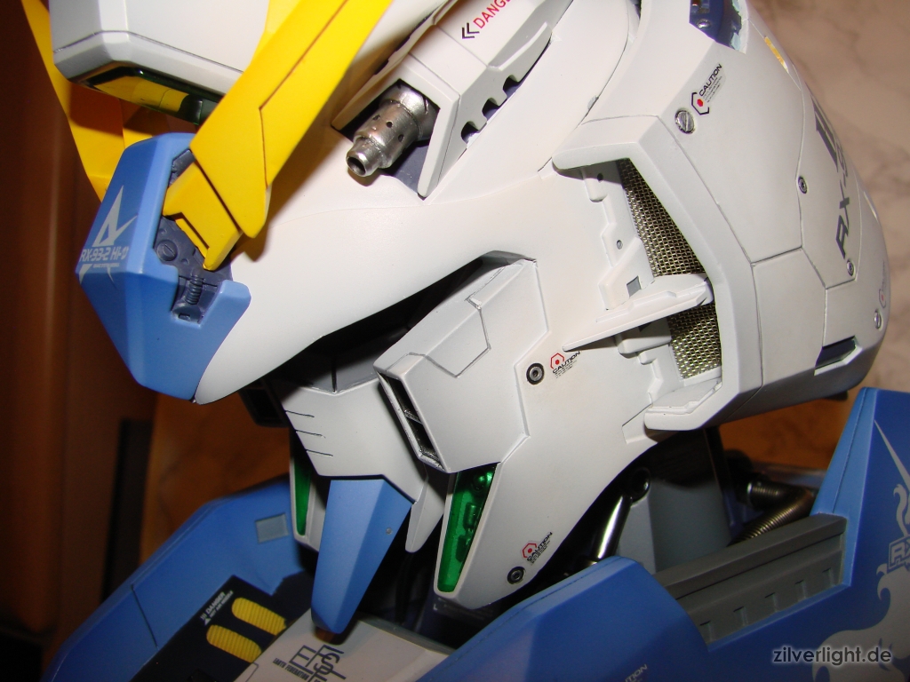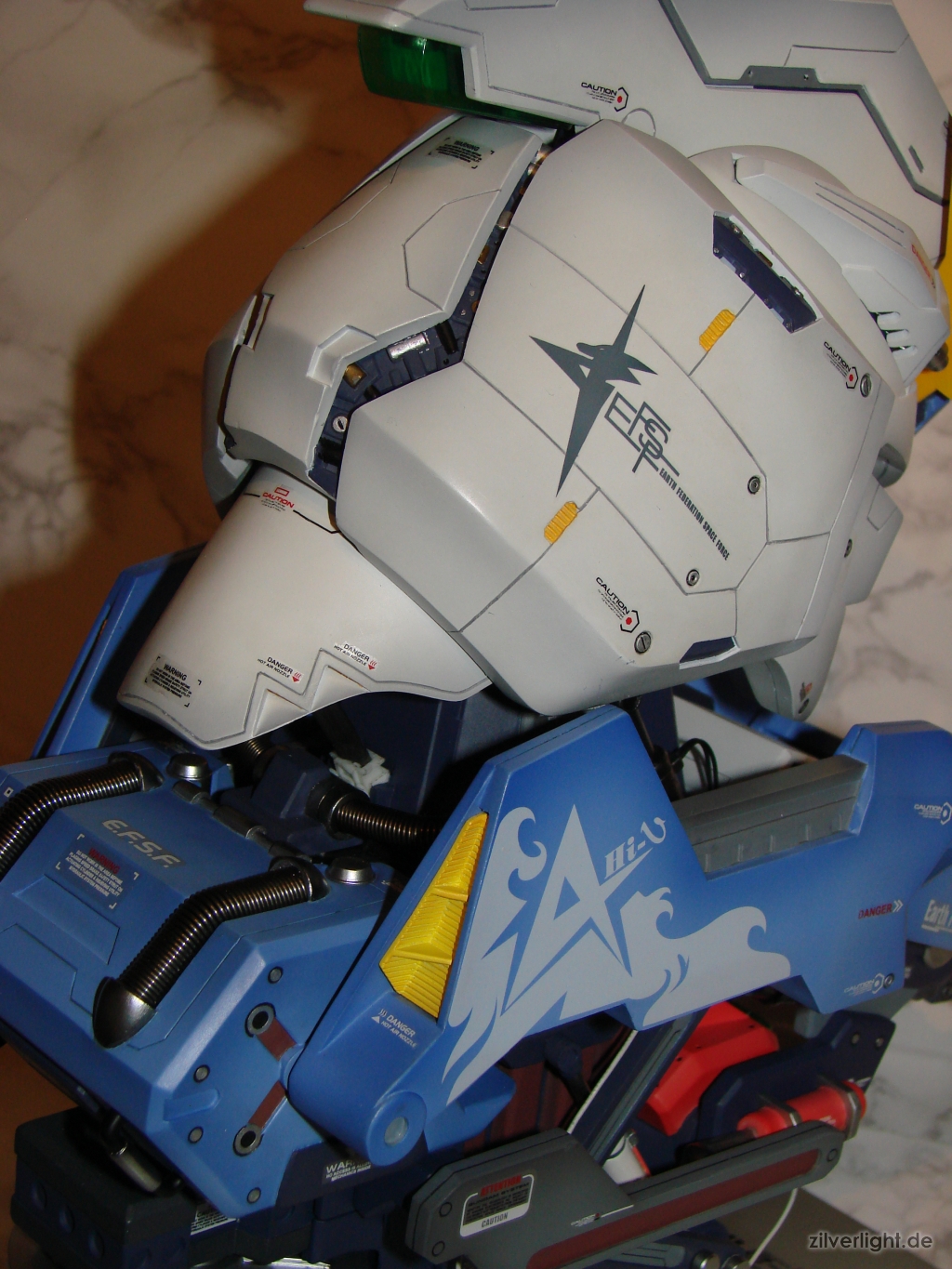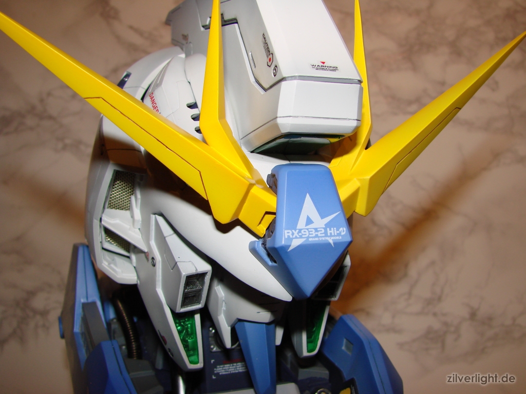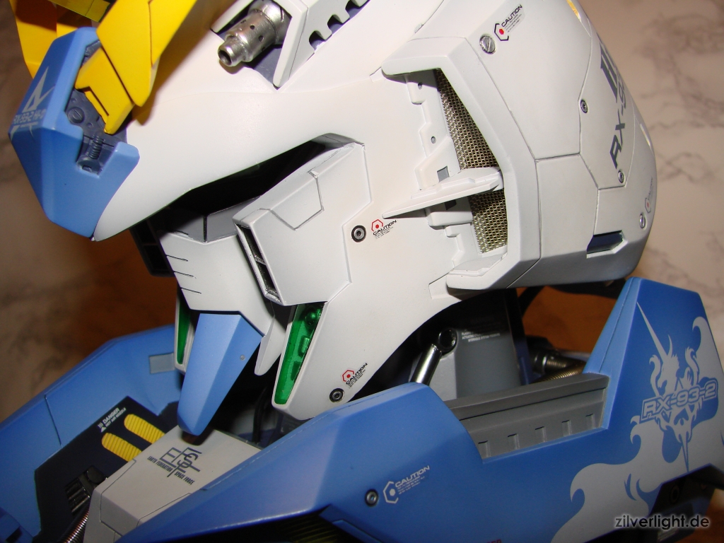 Zuerst zur Umsetzung des Mecha. Das Kit ist im Vergleich zum Original wirklich sehr gut umgesetzt worden. Was die Farbe angeht ist soweit alles sehr schön gestaltet und die Farben passen soweit. Bei dieser Büste hat man sich auf eine Variante des RX-93-2 verlassen, denn der originale RX-93-2, bekannt aus dem Novel “Beltorchika’s Children”, besitzt ein weisses V-Zeichen. Ansonsten ist auch das blau der Büste etwas farbschwacher als im Original, was mir jetzt persönlich sogar richtig gut gefällt auch wenn ich gegen ein kräftigeres blau nichts gehabt hätte. Die Bemalung ist wirklich bis ins letzte Detail feinsäuberlich ausgeführt worden. Absolut perfekt würde ich sagen. Wenn wir beim Detail sind kommen wir doch im nächsten Punkt sofort auf die Markings bzw. Decals zu sprechen. Jegliche Decals sind ebenfalls sauber aufgetragen worden und es finden sich keinerlei Knicke oder Runzeln. Zur Anordnung der Decals. Diese wurden wirklich großzügig aufgetragen und so finden sich typische “Caution” und “Danger” Markings wie man das auch schon von den Designs von Hajime Katoki, dem Designing Gott von Gundam (ich liebe seine Versionen auf jeden Fall), kennt und liebt. Ansonsten sind größere Decals passend angebracht worden.