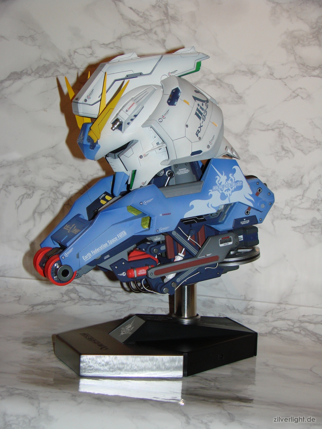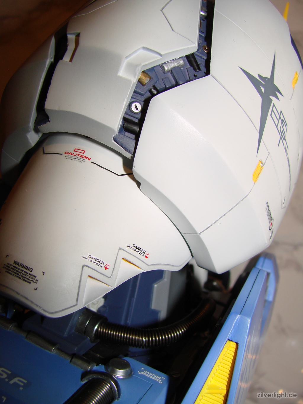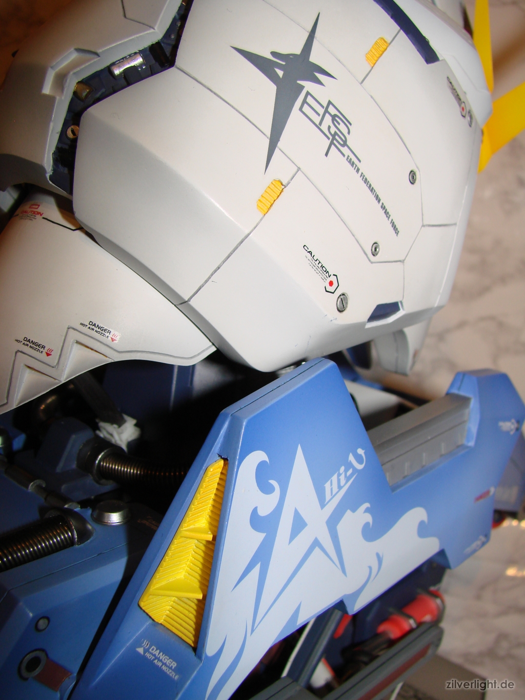 Zuerst zur Umsetzung des Mecha. Das Kit ist im Vergleich zum Original wirklich sehr gut umgesetzt worden. Was die Farbe angeht ist soweit alles sehr schön gestaltet und die Farben passen soweit. Bei dieser Büste hat man sich auf eine Variante des RX-93-2 verlassen, denn der originale RX-93-2, bekannt aus dem Novel “Beltorchika’s Children”, besitzt ein weisses V-Zeichen. Ansonsten ist auch das blau der Büste etwas farbschwacher als im Original, was mir jetzt persönlich sogar richtig gut gefällt auch wenn ich gegen ein kräftigeres blau nichts gehabt hätte. Die Bemalung ist wirklich bis ins letzte Detail feinsäuberlich ausgeführt worden. Absolut perfekt würde ich sagen. Wenn wir beim Detail sind kommen wir doch im nächsten Punkt sofort auf die Markings bzw. Decals zu sprechen. Jegliche Decals sind ebenfalls sauber aufgetragen worden und es finden sich keinerlei Knicke oder Runzeln. Zur Anordnung der Decals. Diese wurden wirklich großzügig aufgetragen und so finden sich typische “Caution” und “Danger” Markings wie man das auch schon von den Designs von Hajime Katoki, dem Designing Gott von Gundam (ich liebe seine Versionen auf jeden Fall), kennt und liebt. Ansonsten sind größere Decals passend angebracht worden.