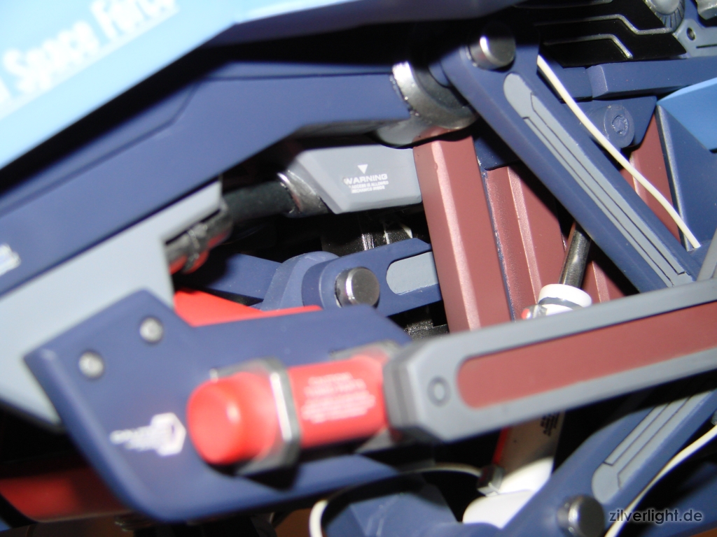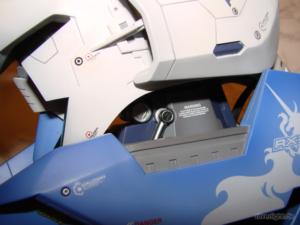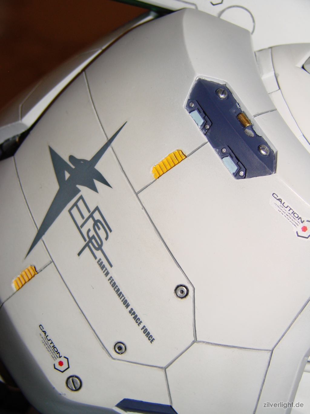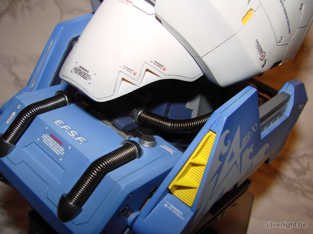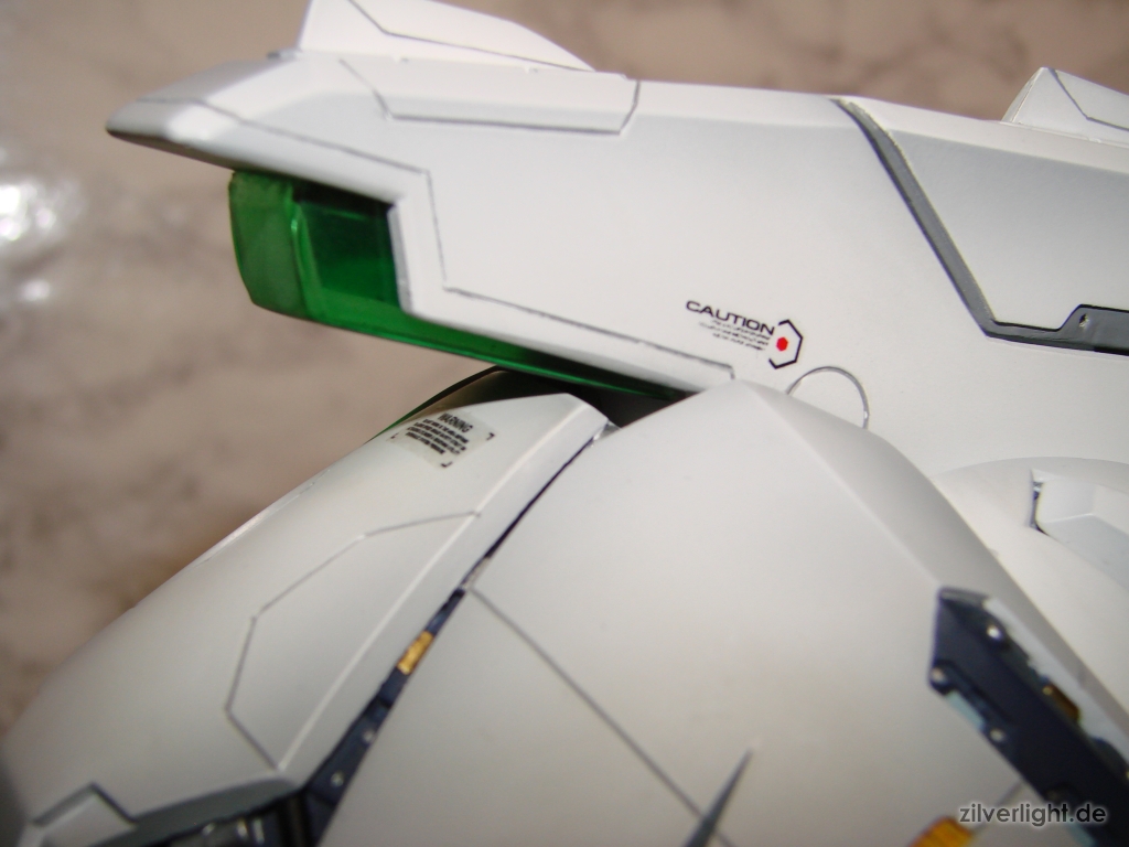 Zuerst zur Umsetzung des Mecha. Das Kit ist im Vergleich zum Original wirklich sehr gut umgesetzt worden. Was die Farbe angeht ist soweit alles sehr schön gestaltet und die Farben passen soweit. Bei dieser Büste hat man sich auf eine Variante des RX-93-2 verlassen, denn der originale RX-93-2, bekannt aus dem Novel “Beltorchika’s Children”, besitzt ein weisses V-Zeichen. Ansonsten ist auch das blau der Büste etwas farbschwacher als im Original, was mir jetzt persönlich sogar richtig gut gefällt auch wenn ich gegen ein kräftigeres blau nichts gehabt hätte. Die Bemalung ist wirklich bis ins letzte Detail feinsäuberlich ausgeführt worden. Absolut perfekt würde ich sagen. Wenn wir beim Detail sind kommen wir doch im nächsten Punkt sofort auf die Markings bzw. Decals zu sprechen. Jegliche Decals sind ebenfalls sauber aufgetragen worden und es finden sich keinerlei Knicke oder Runzeln. Zur Anordnung der Decals. Diese wurden wirklich großzügig aufgetragen und so finden sich typische “Caution” und “Danger” Markings wie man das auch schon von den Designs von Hajime Katoki, dem Designing Gott von Gundam (ich liebe seine Versionen auf jeden Fall), kennt und liebt. Ansonsten sind größere Decals passend angebracht worden.