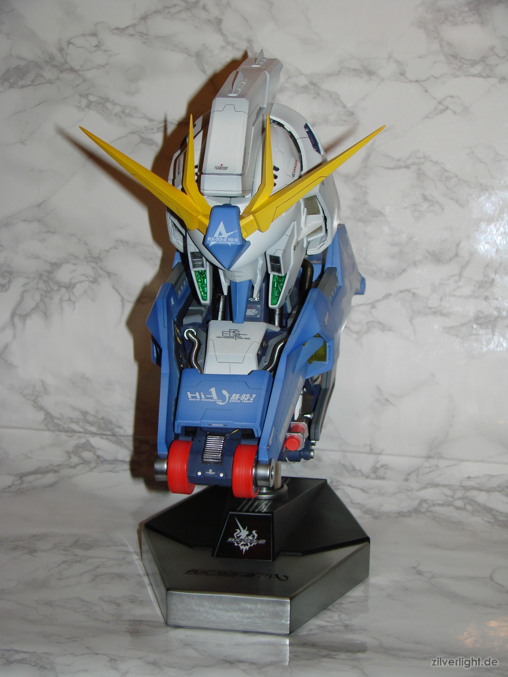 Ich kann nur sagen ich bin absolut beeindruckt von diesem Kit und ich bereue den Kauf kein Stück. Die Optik ist durch die einwandfreie Verarbeitung wunderschön und das Größenverhältnis von 1/24, was einer Höhe von etwa 33cm entspricht, ist mehr als ausreichend, damit das Kit alleine ausgestellt Blicke auf sich ziehen kann auch ohne aktivierte Funktionen. Die Funktionen setzen dem Ganzen meiner Ansicht nach nur noch ein Sahnehäubchen auf, denn persönlich werde ich diese wohl ohnehin nur sehr selten aktivieren. Momentan habe ich nur eine Sache die ich etwas schade an dem Kit finde und das ist, dass es nur einen Power-Button gibt der alle Funktionen aktiviert. Ich hätte es viel schöner gefunden, wenn es zwei separate Power-Buttons gegeben hätte, womit man zum einen die Beleuchtung und zum Anderen die mechanischen Bewegungen nach belieben ein-/ausschalten hätte können. Die mechanischen Bewegungen sind zwar schön, aber Bewegungsmotoren sind nunmal nicht leise und das stört mich dann wiederum doch etwas. Aktuell liebäugle ich daher auch noch mit der Strike Gundam Evolve8 Büste, welche nur Lichtfunktionen besitzt.