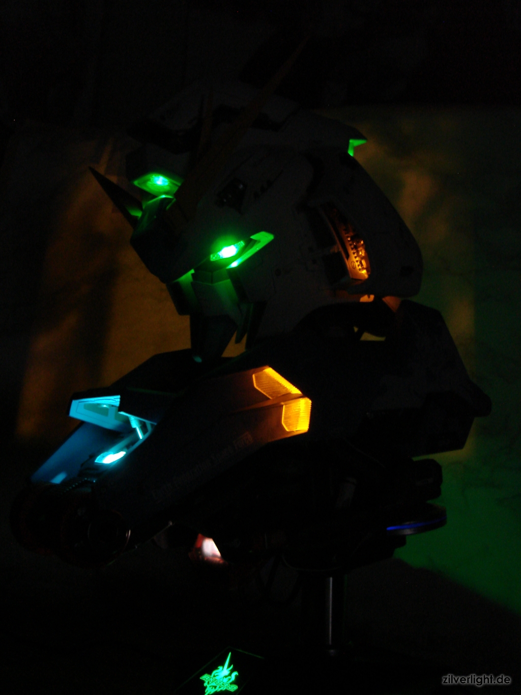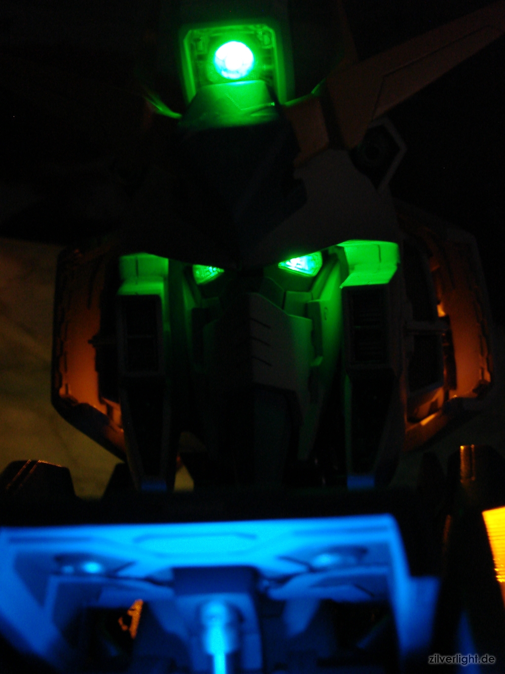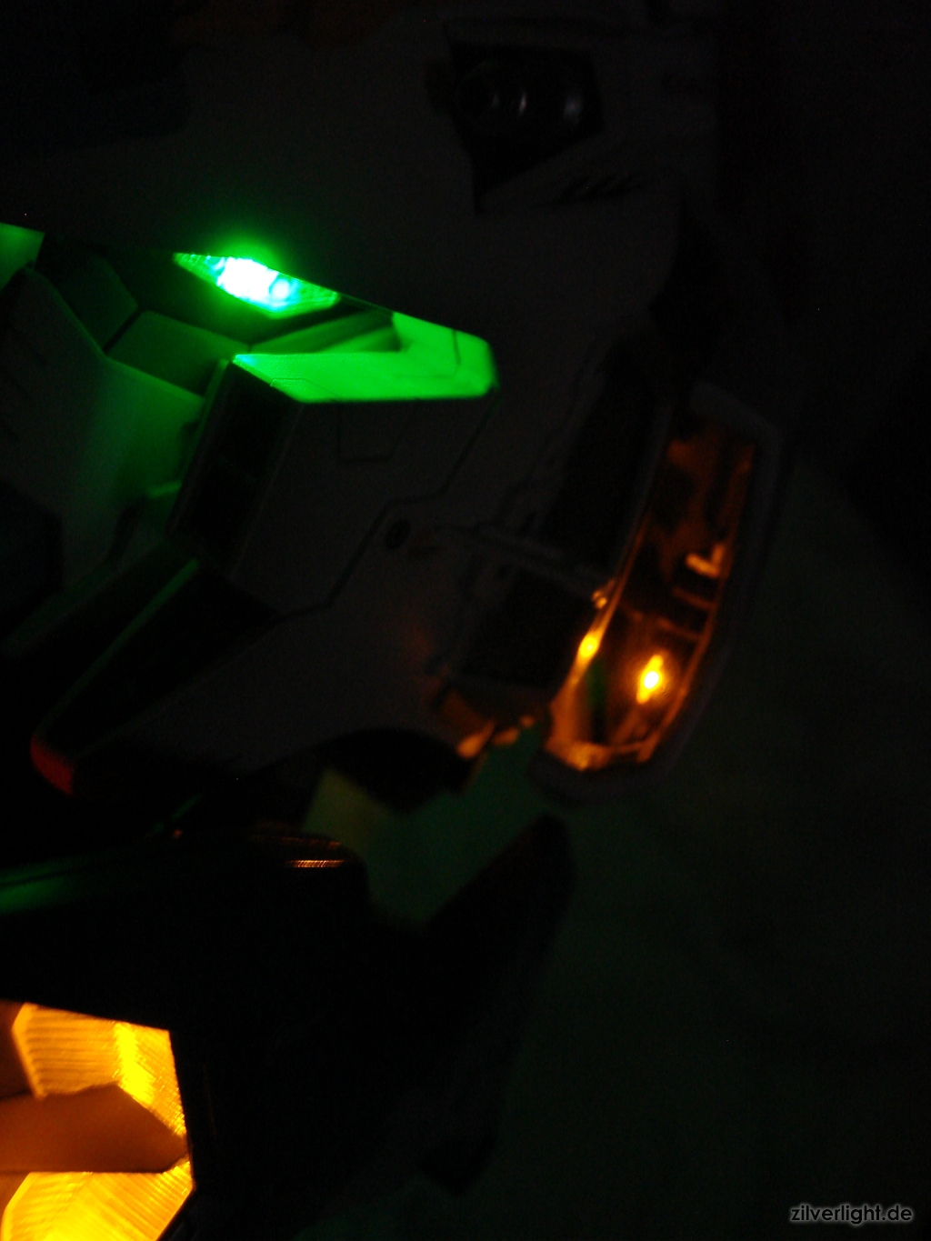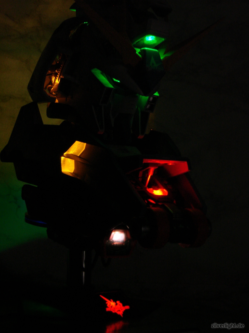 Es werde Licht! Minovsky Partikel volle Kraft! Leider fehlte mir um das Lichtfeature sehr gut darstellen zu können ein Lichtdimmer oder zumindest irgendeine Konstruktion um das Licht “manuell” zu dimmen. So blieb mir nur die Wahl das Licht komplett auszuschalten. Dadurch ist das Licht des RX-93-2 zwar sehr gut ersichtlich, aber der Rest des Gundams ist leider eher in Dunkelheit gehüllt.