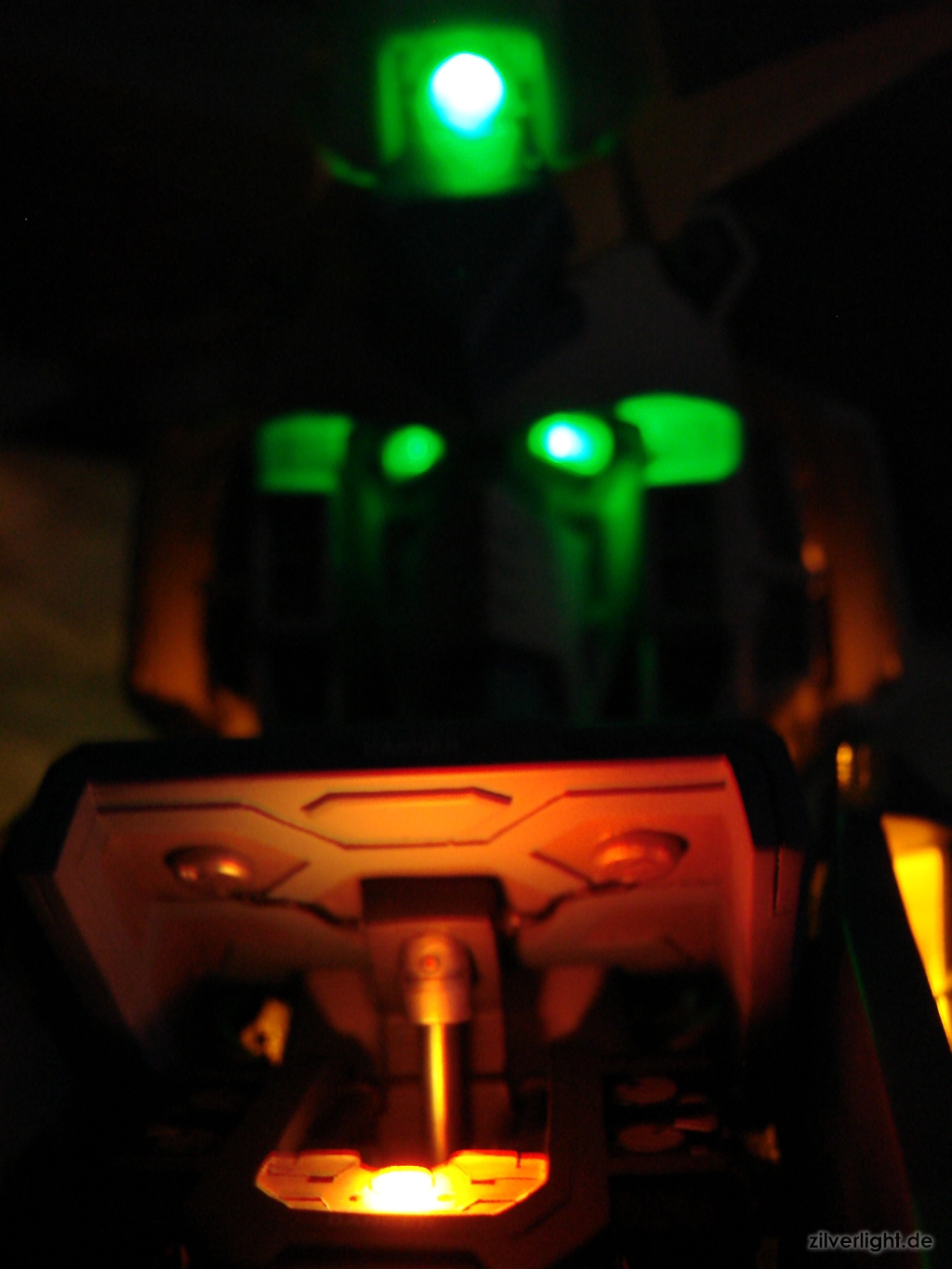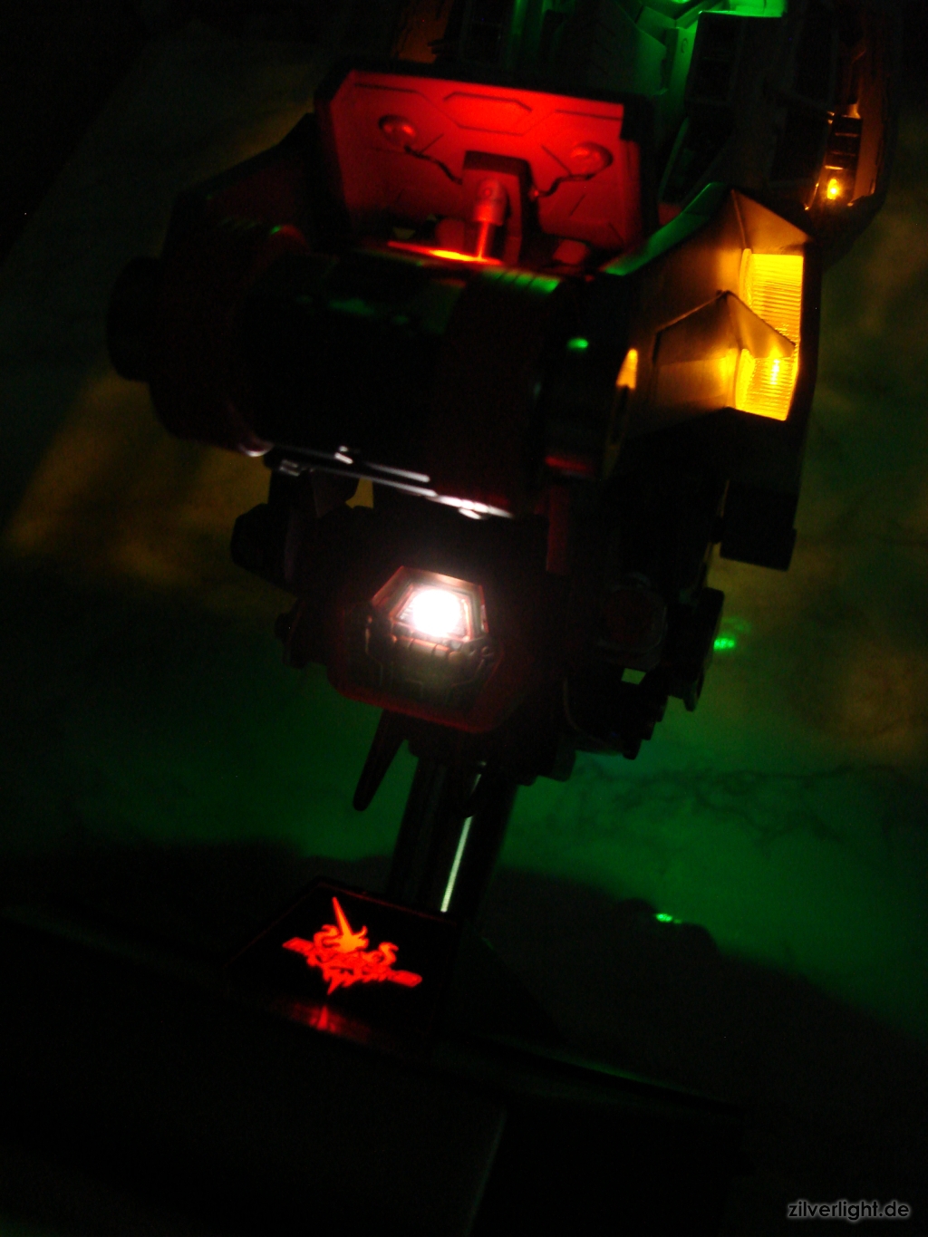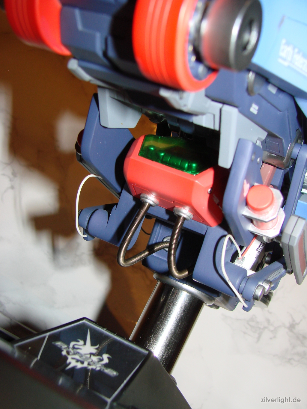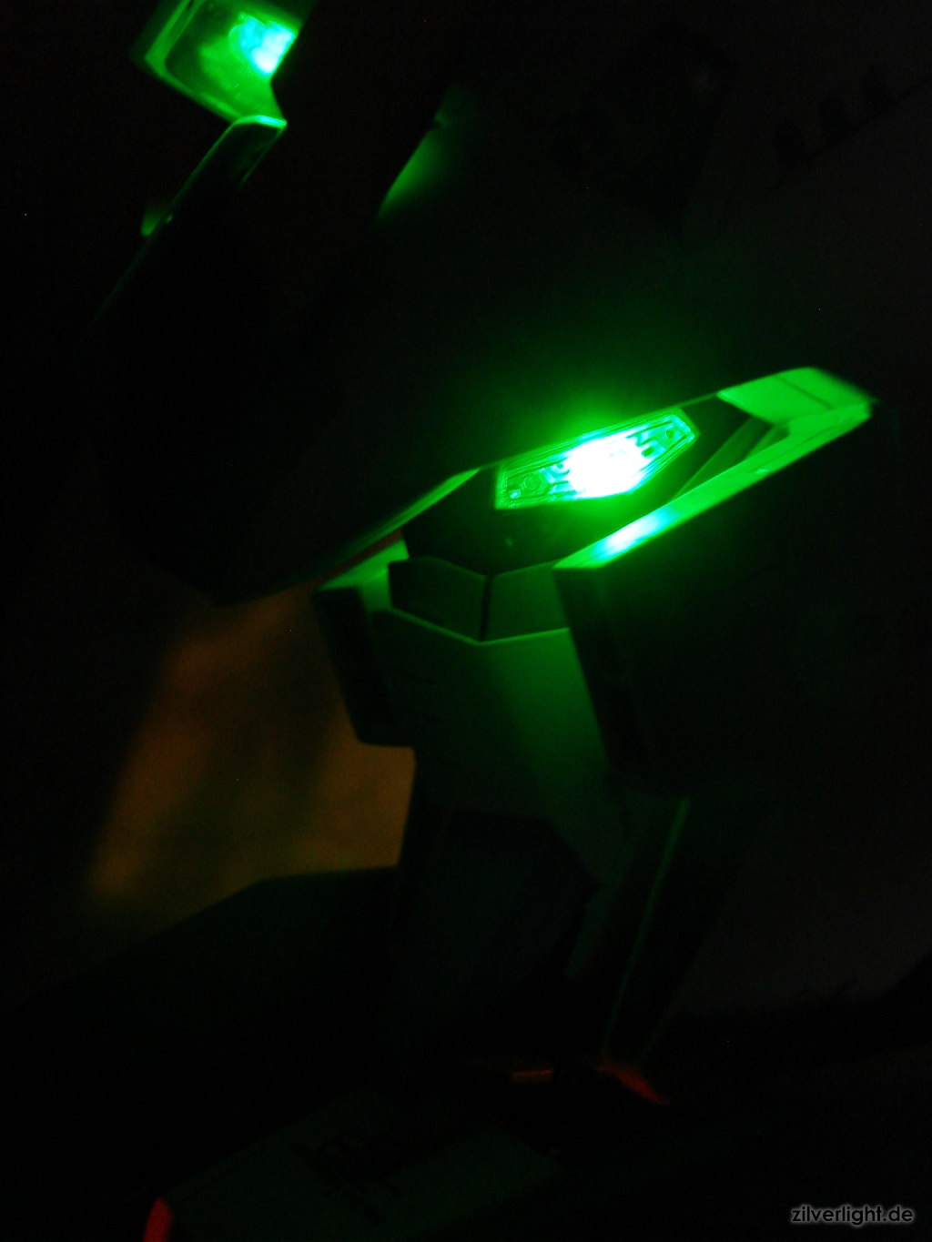 Es werde Licht! Minovsky Partikel volle Kraft! Leider fehlte mir um das Lichtfeature sehr gut darstellen zu können ein Lichtdimmer oder zumindest irgendeine Konstruktion um das Licht “manuell” zu dimmen. So blieb mir nur die Wahl das Licht komplett auszuschalten. Dadurch ist das Licht des RX-93-2 zwar sehr gut ersichtlich, aber der Rest des Gundams ist leider eher in Dunkelheit gehüllt.