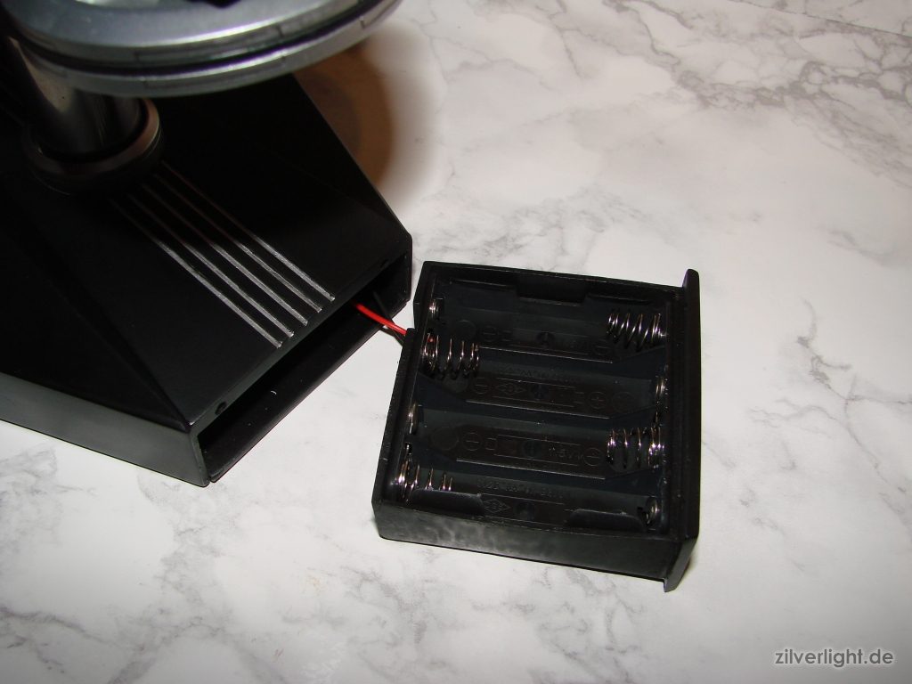 Wie bereits erwähnt kann die Büste durch zwei Möglichkeiten mit Minovsky Partikel versorgt werden. Man hat die Wahl zwischen vier AA-Batterien oder einem AC Adapter, welcher jedoch einen Steckeradapter für das dt. Stromnetz benötigt, sofern man keinen heimischen AC Adapter besitzt.