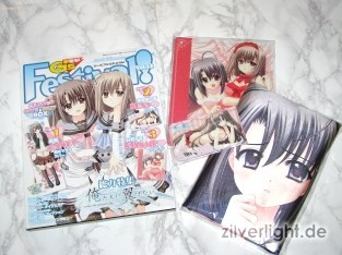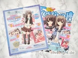 Die diesmalige Dengeki G’s Festival, in ihrer bereits 14.Ausgabe, beschäftigt sich mit dem neuen Eroge von Entwickler Navel, namens Oretachi ni Tsubasa wa Nai. Bereits die Herbstausgabe von 2008 der Dengeki G’s Festival Comic beschäftigte sich bei den Extras schon ansatzweise mit Navels neuestem Titel. Die Festival Vol.14 enthielt dieses Mal die so genannte “Cute & Sexy Box” mit wie immer drei Extras. Der Preis betrug hierbei 2.800Yen (ca. 22,44€). Bei dieser Ausgabe habe ich es mir nicht nehmen lassen mal wieder zwei Stück davon zu kaufen. Aoi Nishimata Design auf den Extras waren hierbei Grund genug für mich mir mal wieder zwei Festival Ausgaben zu kaufen.