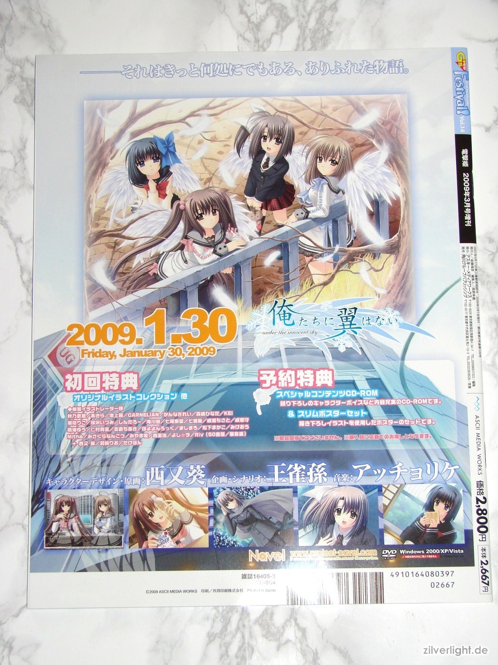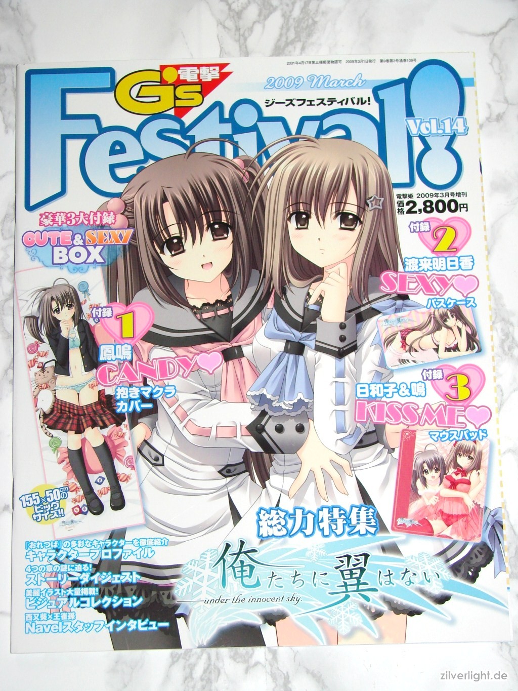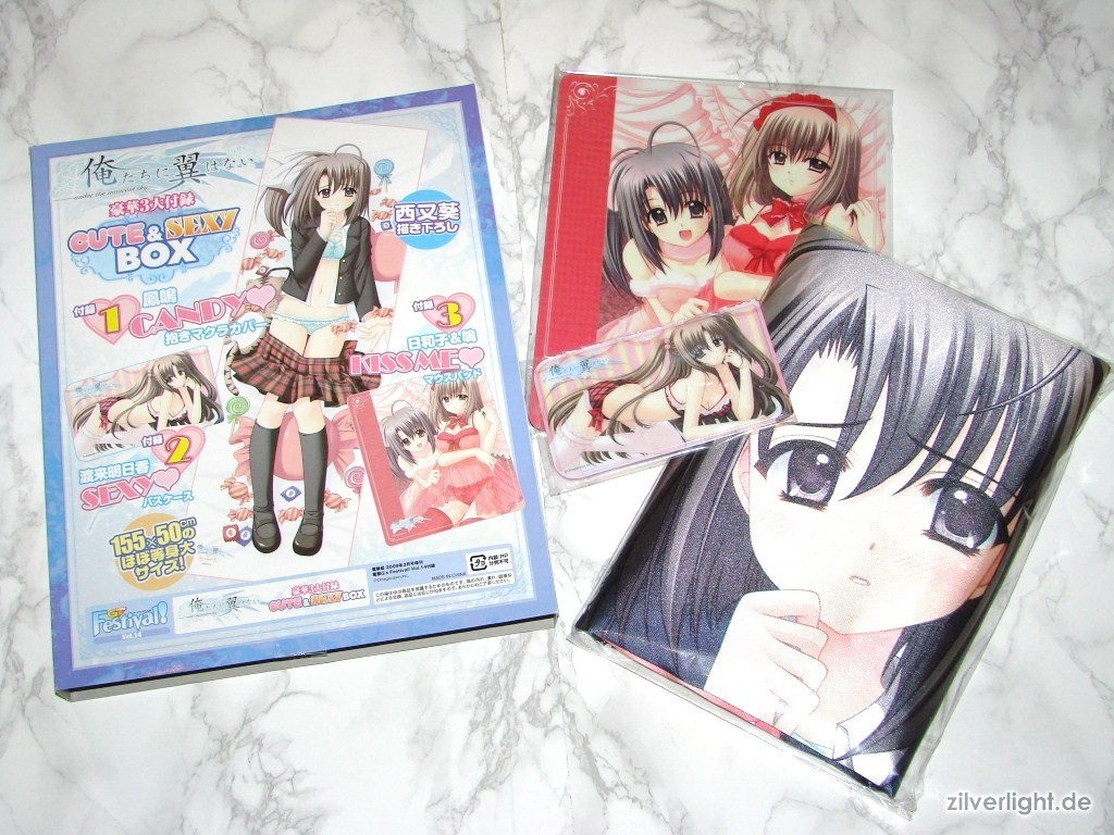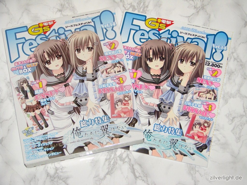 Die diesmalige Dengeki G’s Festival, in ihrer bereits 14.Ausgabe, beschäftigt sich mit dem neuen Eroge von Entwickler Navel, namens Oretachi ni Tsubasa wa Nai. Bereits die Herbstausgabe von 2008 der Dengeki G’s Festival Comic beschäftigte sich bei den Extras schon ansatzweise mit Navels neuestem Titel. Die Festival Vol.14 enthielt dieses Mal die so genannte “Cute & Sexy Box” mit wie immer drei Extras. Der Preis betrug hierbei 2.800Yen (ca. 22,44€). Bei dieser Ausgabe habe ich es mir nicht nehmen lassen mal wieder zwei Stück davon zu kaufen. Aoi Nishimata Design auf den Extras waren hierbei Grund genug für mich mir mal wieder zwei Festival Ausgaben zu kaufen.