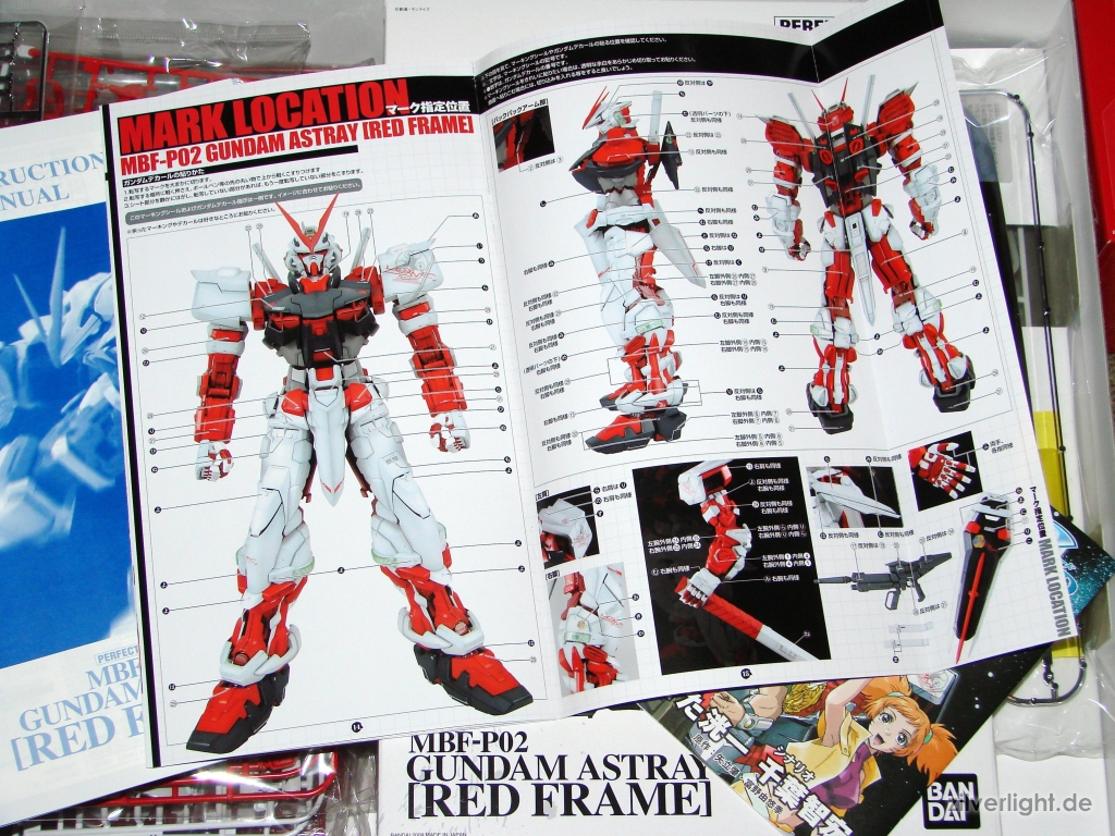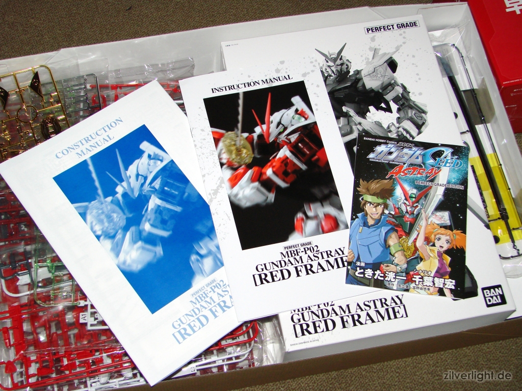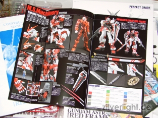 Rechts unten seht ihr in blau/weiss die Anleitung mit insgesamt 25 Seiten (irgendwie weniger als erwartet ^^). Daneben das Instruction Manualin sehr hochwertiger Qualität. Zum Schluss noch ein kleiner Astray Manga(Umfang etwa 1-2 Manga Kapitel). Das beste am Manga ist, dass sich Bandai doch tatsähclich die Mühe gemacht hat und sogar englische Übersetzungen am unteren Rand des Heftes mitgeliefert hat. Eventuell gibt es dann für den Manga einen extra Beitrag in welchem er komplett abgeknipst/gescannt ist (^^).