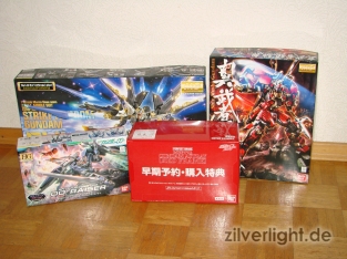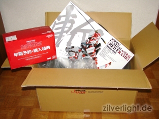 Selbst gehöre ich zu den Besitzern der Initial Production Version, welche noch zusätzlich zum Kit Extrateile (rote Box) dazubekamen. Dafür war die Erstauflage auch 2.000Yen teurer. Die Box mit den Zusatzteilen ist exakt so groß wie die Master Grade Box vom RX-78-2.