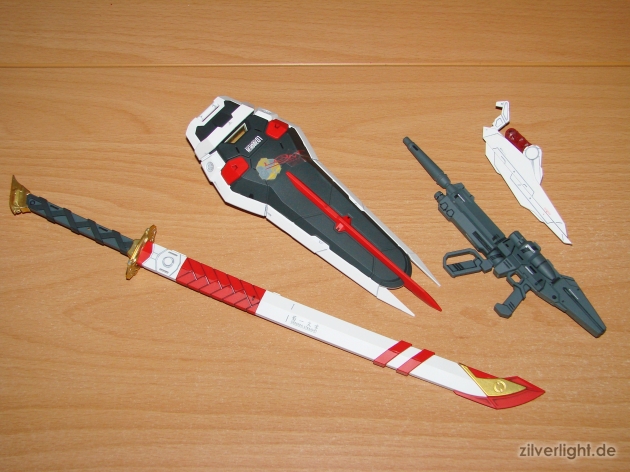 Wie bereits in den vorherigen Beiträgen erwähnt habe ich die Initial Production Box mit dem Tiger Pierce Katana und den anderen Zusatzteilen noch nicht angerührt. Daher hier nur das Gerbera Straight Katana, die Type 71 Beam Rifle, das Schild und natürlich die Katanahalterung für den Astray.