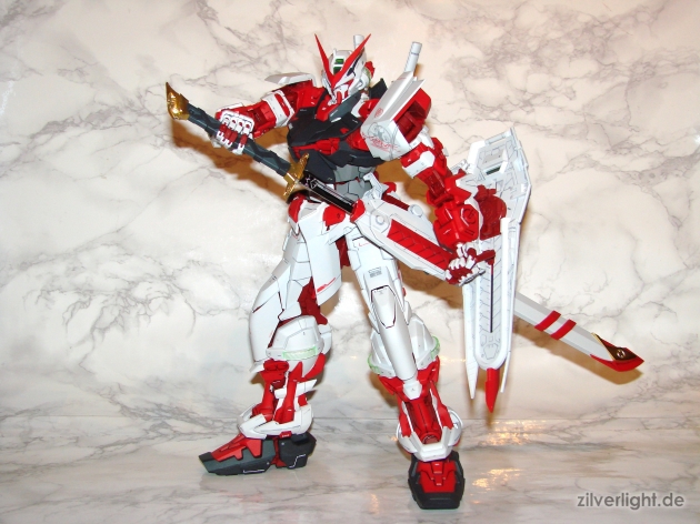 Die letztendliche Optik des Gundams gefällt mir wirklich ausgesprochen gut, wobei man hier selbstverständlich ein klein wenig Arbeit in Decals und panel lining stecken muss. Was die Features angeht ist es ein wenig schade, dass der Astray das erste PG-Kit ist, welches keine offenzulegenden Rüstungsteile besitzt. Auch die eingeschränktere Beweglichkeit durch die Rüstung ist ein wenig schade. Allerdings ist der Astray auch mit der Einschränkung in Sachen Bewegung trotzdem in wunderbare Posen zu bringen, sicherlich noch bessere als ihr sie hier sehen werdet (^^”). Mit Ausnahme der eingeschränkteren Beweglichkeit und den nicht offenzulegender Rüstungsteile, welche ich ohnehin nur als nettes Gimmik ansehe und wohl nur ein/zwei Mal wirklich anwenden würde, habe ich an dem Kit wirklich nichts auszusetzen. Der PG Astray wird auf jeden Fall nicht mein letztes PG gewesen sein, jedoch zumindest für längere Zeit, denn vorher müssen erst mal wieder ein paar MGs her (^^).