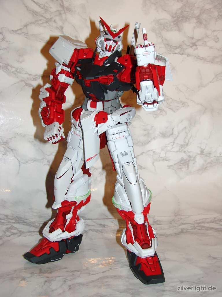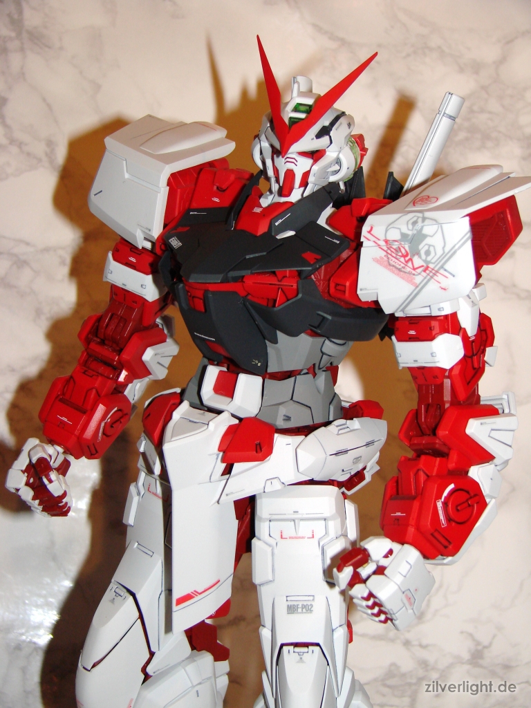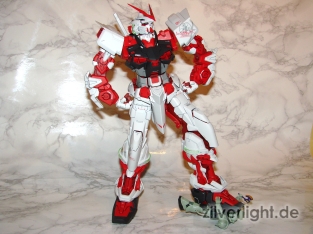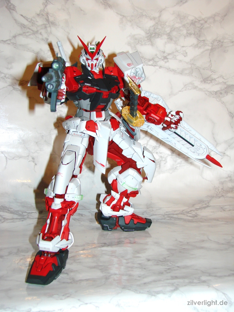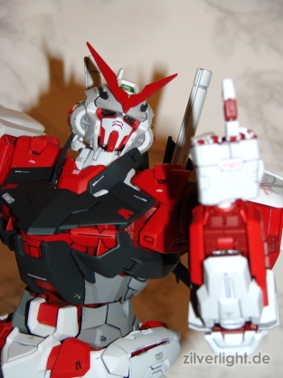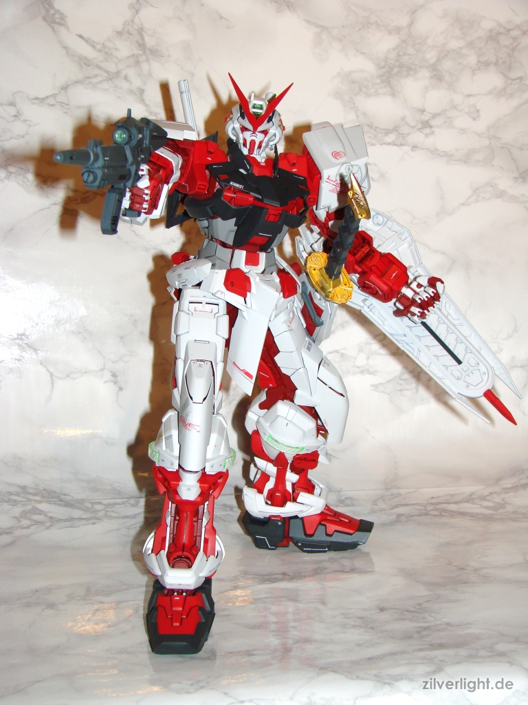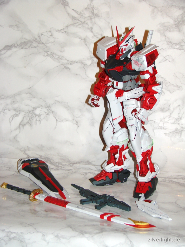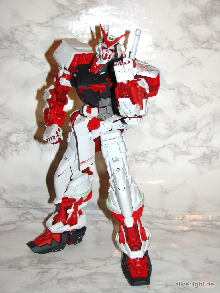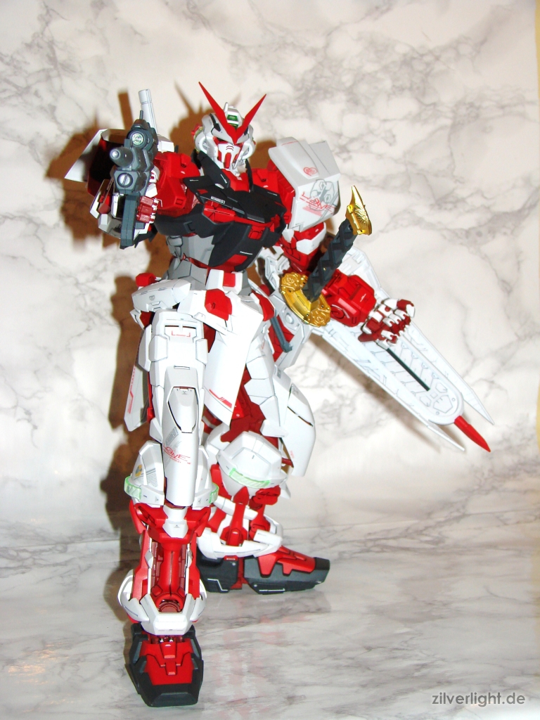 Die letztendliche Optik des Gundams gefällt mir wirklich ausgesprochen gut, wobei man hier selbstverständlich ein klein wenig Arbeit in Decals und panel lining stecken muss. Was die Features angeht ist es ein wenig schade, dass der Astray das erste PG-Kit ist, welches keine offenzulegenden Rüstungsteile besitzt. Auch die eingeschränktere Beweglichkeit durch die Rüstung ist ein wenig schade. Allerdings ist der Astray auch mit der Einschränkung in Sachen Bewegung trotzdem in wunderbare Posen zu bringen, sicherlich noch bessere als ihr sie hier sehen werdet (^^”). Mit Ausnahme der eingeschränkteren Beweglichkeit und den nicht offenzulegender Rüstungsteile, welche ich ohnehin nur als nettes Gimmik ansehe und wohl nur ein/zwei Mal wirklich anwenden würde, habe ich an dem Kit wirklich nichts auszusetzen. Der PG Astray wird auf jeden Fall nicht mein letztes PG gewesen sein, jedoch zumindest für längere Zeit, denn vorher müssen erst mal wieder ein paar MGs her (^^).