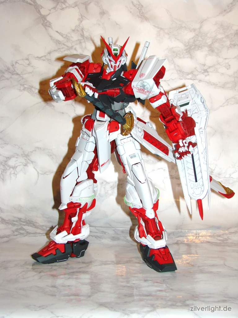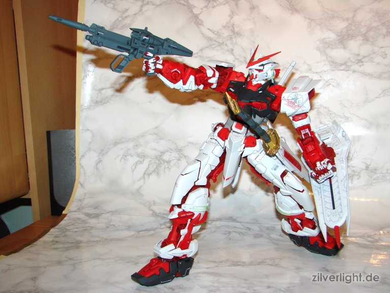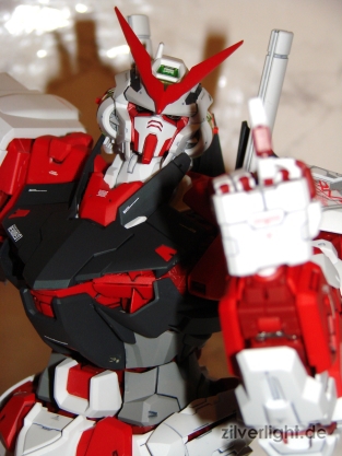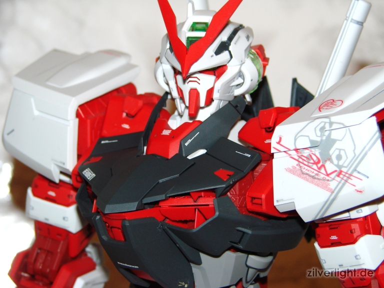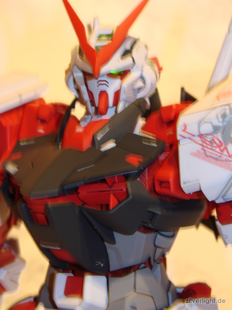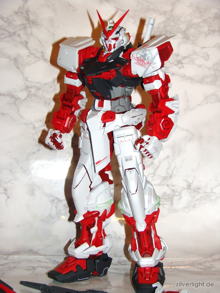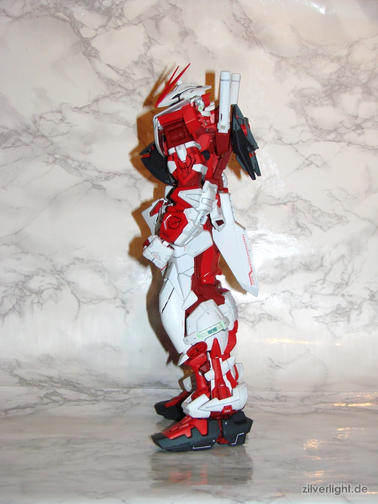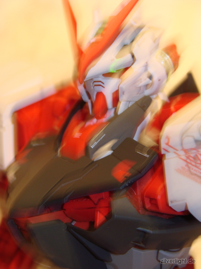 Die letztendliche Optik des Gundams gefällt mir wirklich ausgesprochen gut, wobei man hier selbstverständlich ein klein wenig Arbeit in Decals und panel lining stecken muss. Was die Features angeht ist es ein wenig schade, dass der Astray das erste PG-Kit ist, welches keine offenzulegenden Rüstungsteile besitzt. Auch die eingeschränktere Beweglichkeit durch die Rüstung ist ein wenig schade. Allerdings ist der Astray auch mit der Einschränkung in Sachen Bewegung trotzdem in wunderbare Posen zu bringen, sicherlich noch bessere als ihr sie hier sehen werdet (^^”). Mit Ausnahme der eingeschränkteren Beweglichkeit und den nicht offenzulegender Rüstungsteile, welche ich ohnehin nur als nettes Gimmik ansehe und wohl nur ein/zwei Mal wirklich anwenden würde, habe ich an dem Kit wirklich nichts auszusetzen. Der PG Astray wird auf jeden Fall nicht mein letztes PG gewesen sein, jedoch zumindest für längere Zeit, denn vorher müssen erst mal wieder ein paar MGs her (^^).