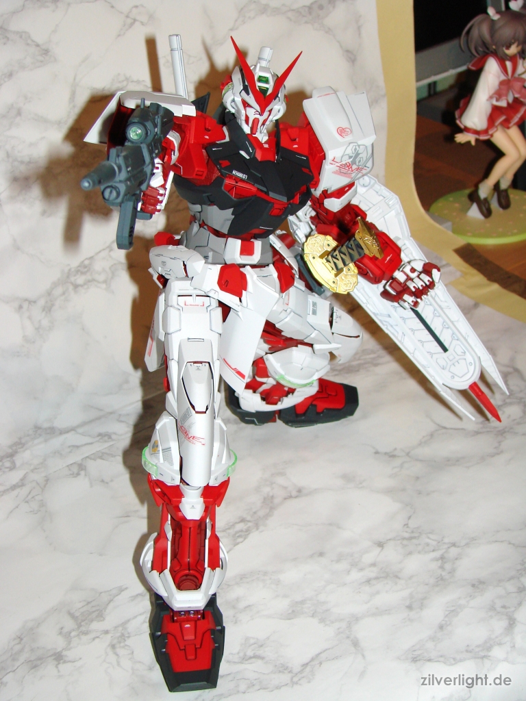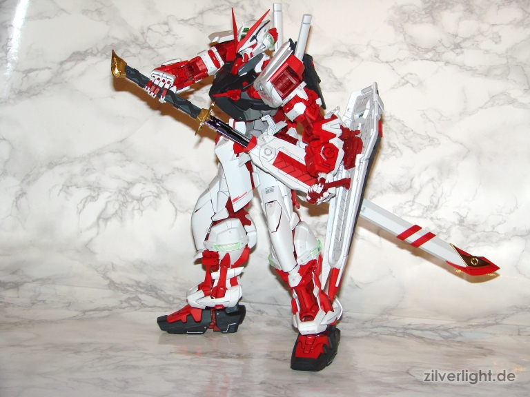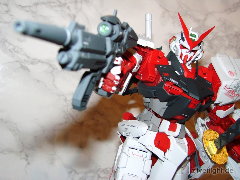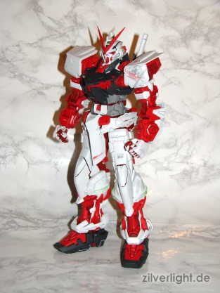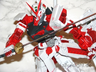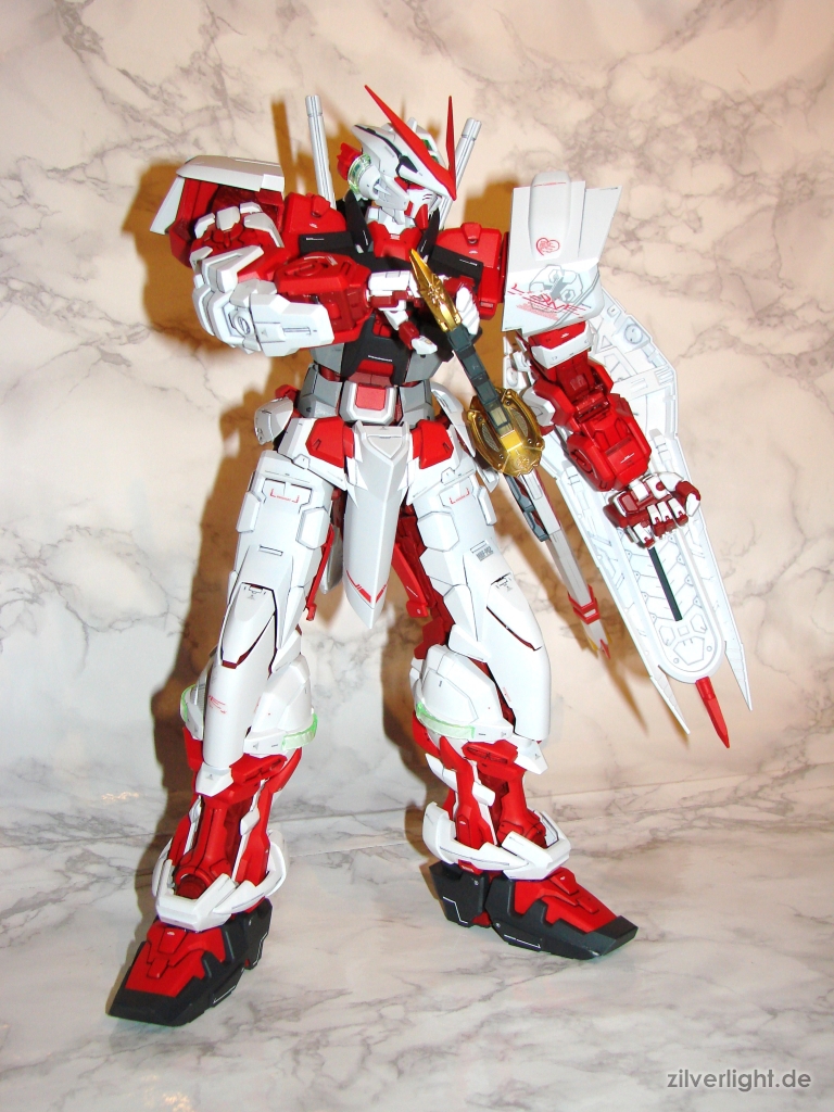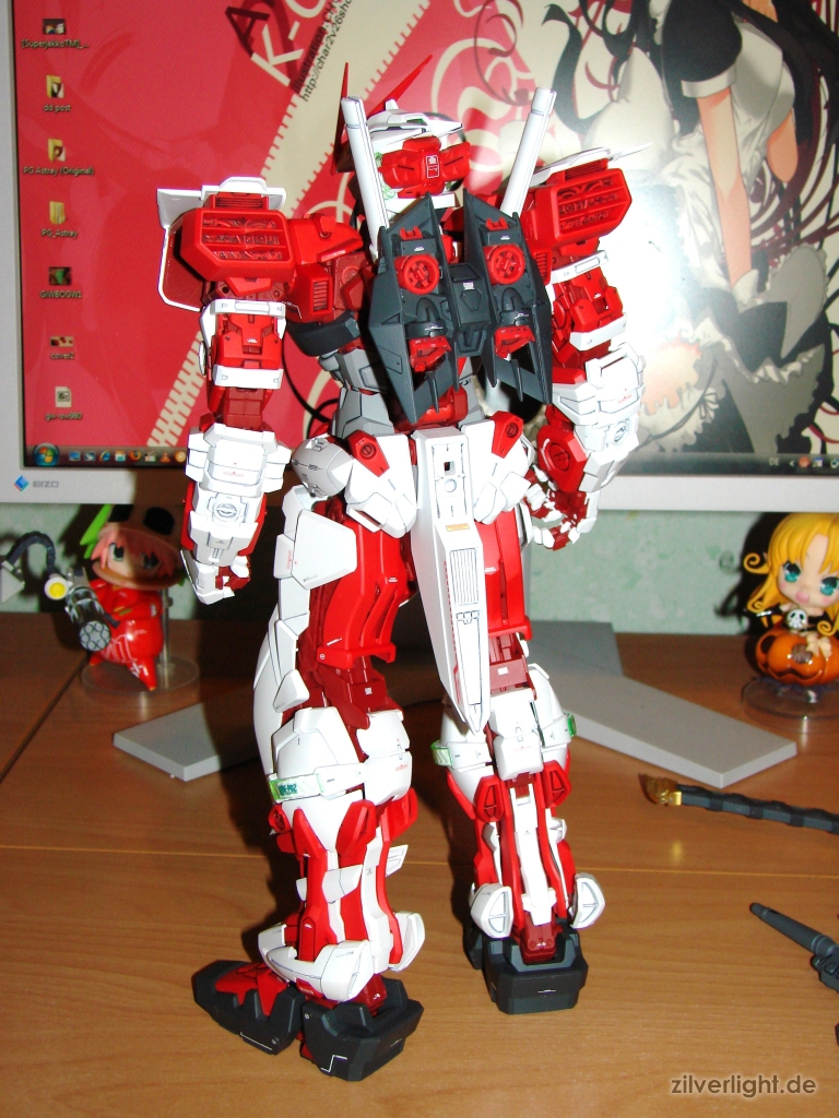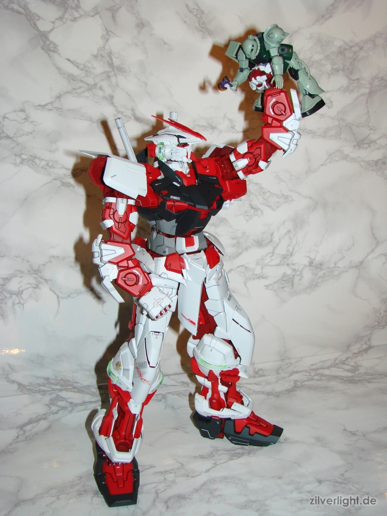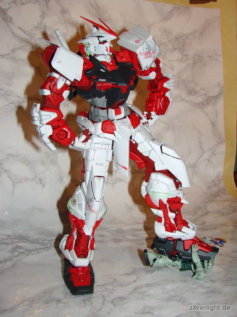 Die letztendliche Optik des Gundams gefällt mir wirklich ausgesprochen gut, wobei man hier selbstverständlich ein klein wenig Arbeit in Decals und panel lining stecken muss. Was die Features angeht ist es ein wenig schade, dass der Astray das erste PG-Kit ist, welches keine offenzulegenden Rüstungsteile besitzt. Auch die eingeschränktere Beweglichkeit durch die Rüstung ist ein wenig schade. Allerdings ist der Astray auch mit der Einschränkung in Sachen Bewegung trotzdem in wunderbare Posen zu bringen, sicherlich noch bessere als ihr sie hier sehen werdet (^^”). Mit Ausnahme der eingeschränkteren Beweglichkeit und den nicht offenzulegender Rüstungsteile, welche ich ohnehin nur als nettes Gimmik ansehe und wohl nur ein/zwei Mal wirklich anwenden würde, habe ich an dem Kit wirklich nichts auszusetzen. Der PG Astray wird auf jeden Fall nicht mein letztes PG gewesen sein, jedoch zumindest für längere Zeit, denn vorher müssen erst mal wieder ein paar MGs her (^^).