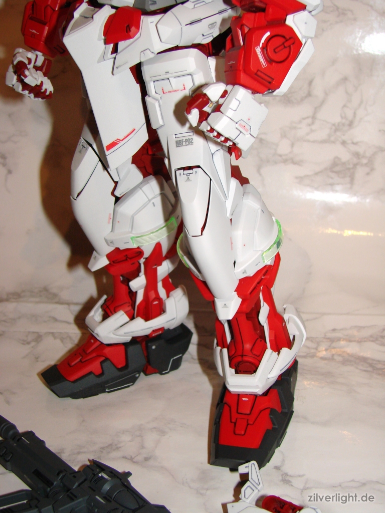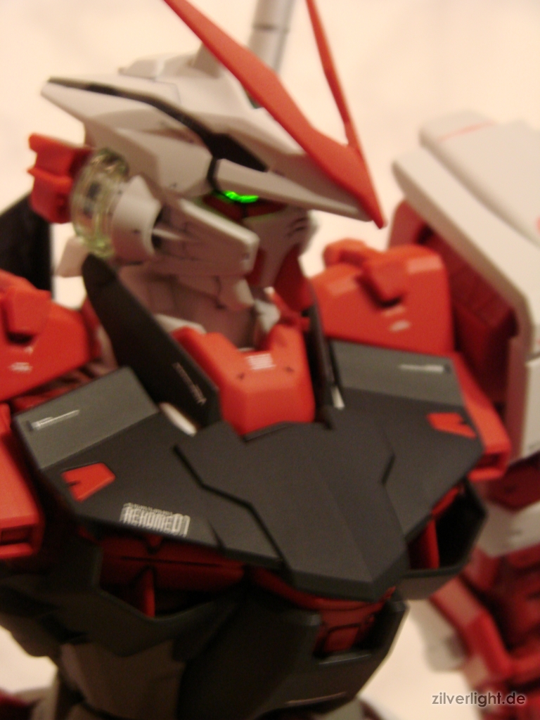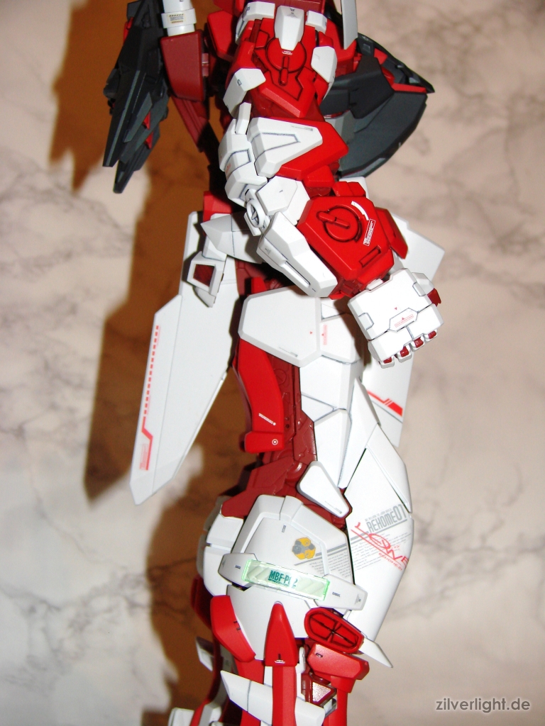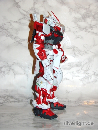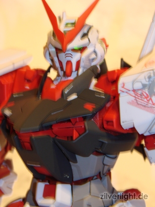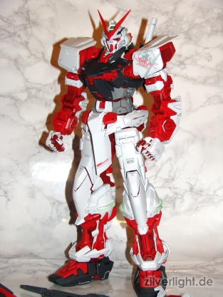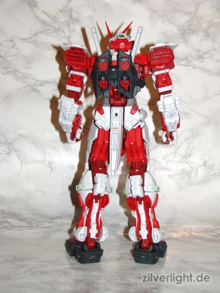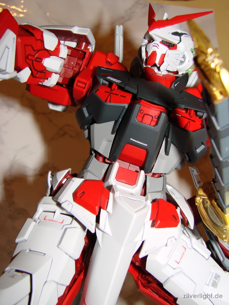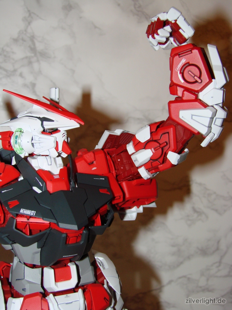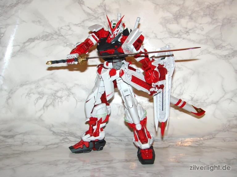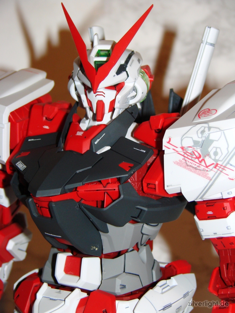 Die letztendliche Optik des Gundams gefällt mir wirklich ausgesprochen gut, wobei man hier selbstverständlich ein klein wenig Arbeit in Decals und panel lining stecken muss. Was die Features angeht ist es ein wenig schade, dass der Astray das erste PG-Kit ist, welches keine offenzulegenden Rüstungsteile besitzt. Auch die eingeschränktere Beweglichkeit durch die Rüstung ist ein wenig schade. Allerdings ist der Astray auch mit der Einschränkung in Sachen Bewegung trotzdem in wunderbare Posen zu bringen, sicherlich noch bessere als ihr sie hier sehen werdet (^^”). Mit Ausnahme der eingeschränkteren Beweglichkeit und den nicht offenzulegender Rüstungsteile, welche ich ohnehin nur als nettes Gimmik ansehe und wohl nur ein/zwei Mal wirklich anwenden würde, habe ich an dem Kit wirklich nichts auszusetzen. Der PG Astray wird auf jeden Fall nicht mein letztes PG gewesen sein, jedoch zumindest für längere Zeit, denn vorher müssen erst mal wieder ein paar MGs her (^^).