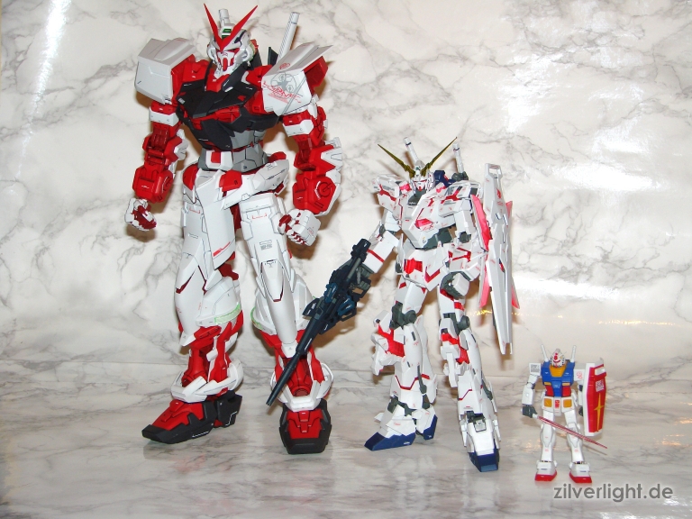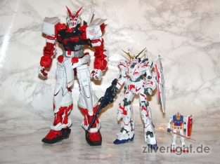 Kein PG-Review ohne Größenvergleich. Links seht ihr den PG Astray (1/60), daneben in der Mitte den MG Unicorn (1/100) und ganz rechts den HCM-Pro RX-78-2 (1/200). Dazu sei gesagt, dass der Unicorn Gundam im gezeigten Destroy Mode einer der größeren Gundams ist. Ich hätte gerne noch einen “normal großen” Gundam im 1/100 Maßstab dazu gestellt, aber alle anderen waren zu der Zeit weniger gut erreichbar für mich.