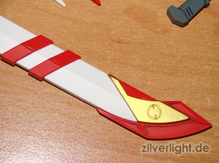 Die Goldteile habe ich ebenfalls mit TopCoat besprüht, so ergab es einen edlen Goldton. Es ist vermutlich etwas schwierig zu erkennen (selbst wenn ihr auf das Bild für die vergrößerte Version klickt) auf dem unteren linken Bild, jedoch könnt ihr hoffentlich den Unterschied erkennen. Das goldene Gitter wurde auf der rechten oberen Seite mit TopCoat besprüht, der Rest wurde unbehandelt belassen. Der Vergleich sollte leichter fallen, wenn ihr das Gitter mit der Schwertscheide auf der rechten Seite vergleicht.