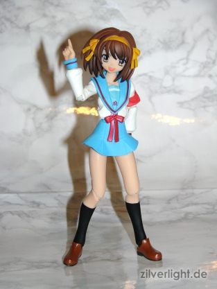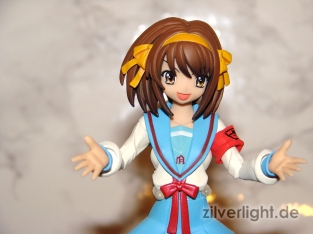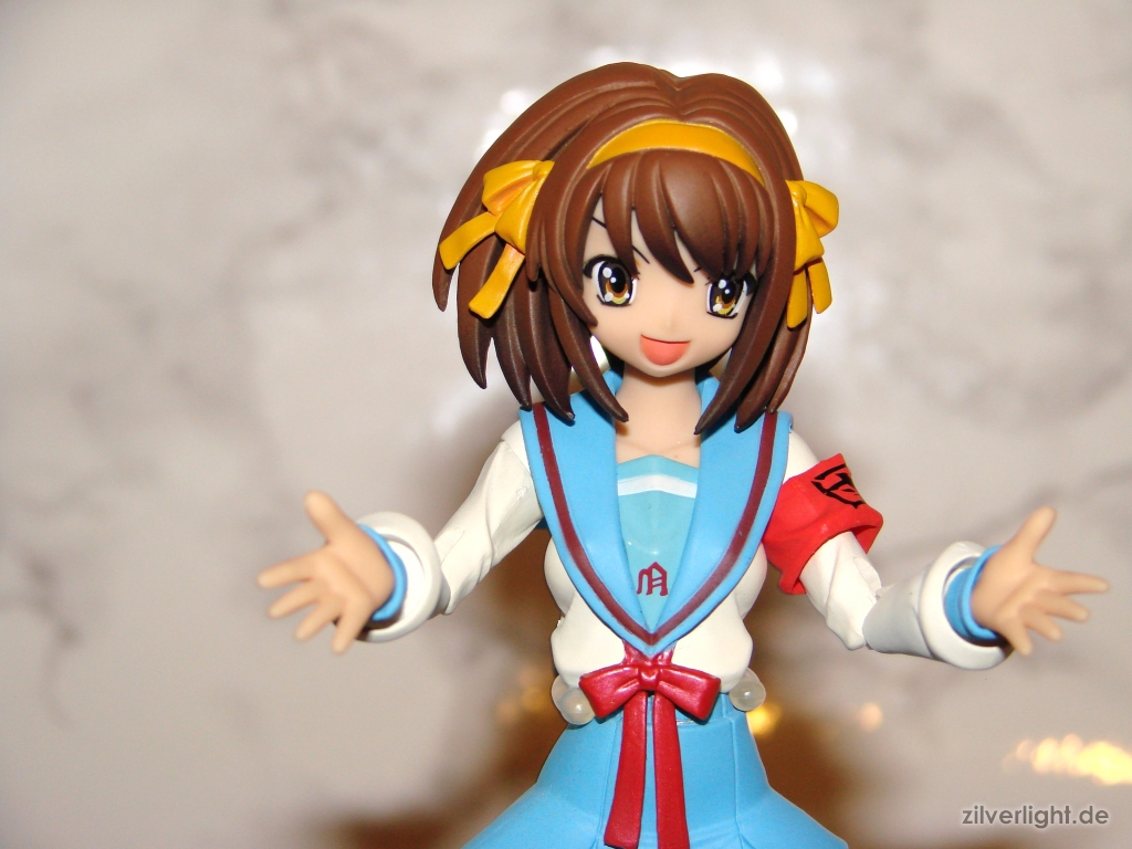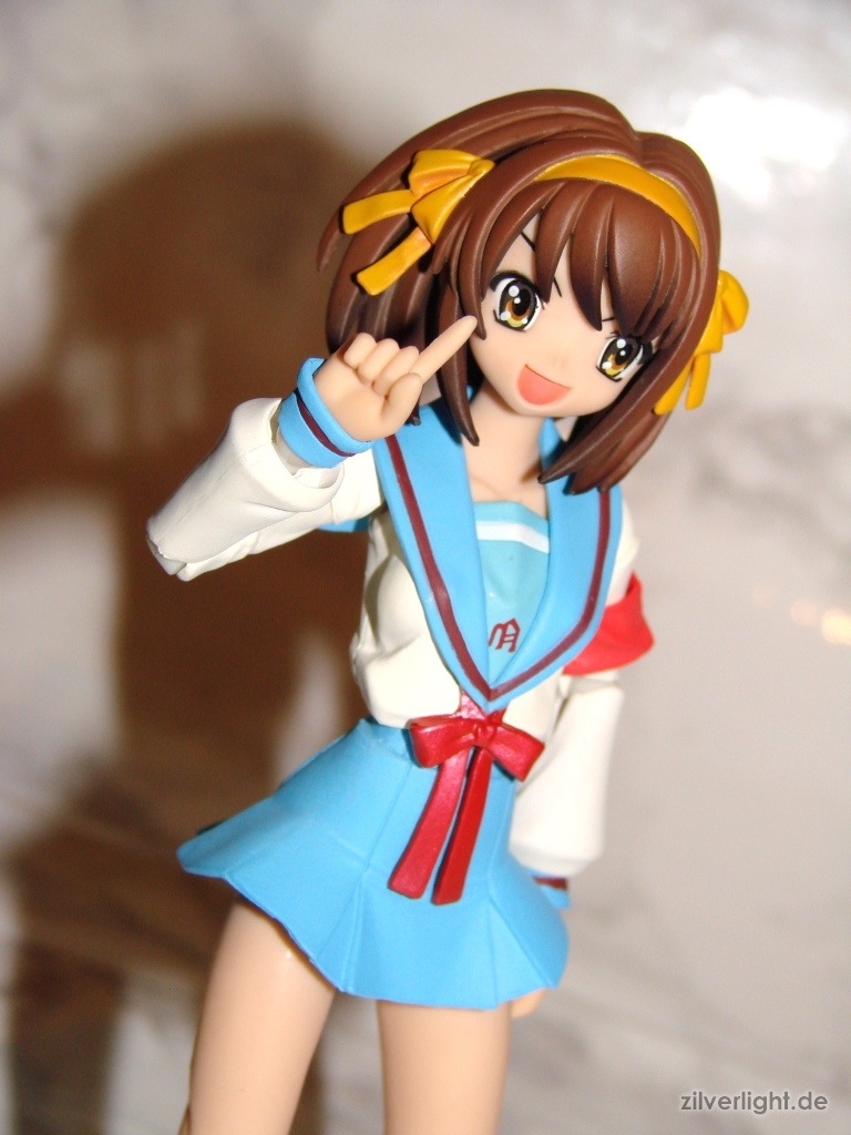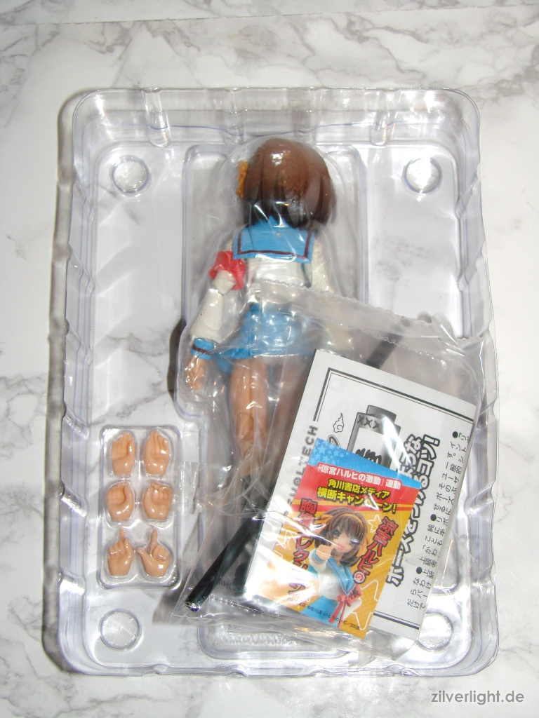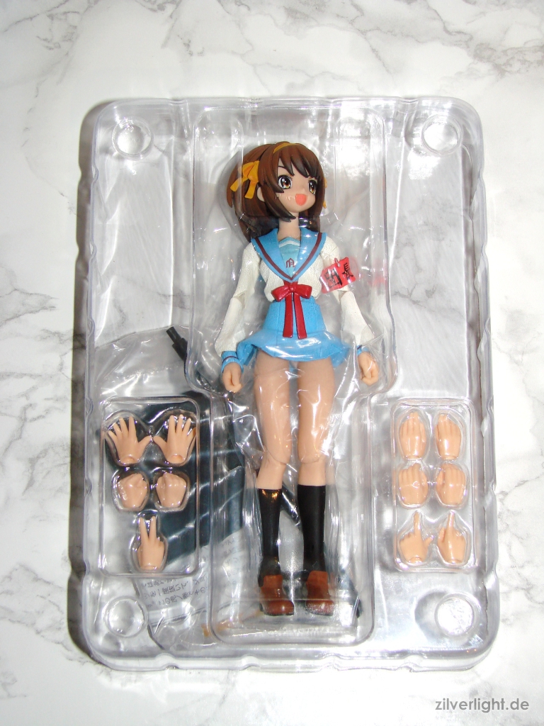 Die Revoltech Haruhi stammt wie der Name schon eindeutig zeigt vom Hersteller Kaiyodo. Haruhi gehört hierbei zur neueren Linie von Revoltech-Figuren, namens “Fräulein Revoltech”. Die Figur liefert einige Hände und eine Base mit. Zusätzlich gab es vor einiger Zeit Magazine mit alternativen Oberkörpern als Extra. Persönlich besitze ich aber keines dieser Extras, da ich mich eigentlich nicht sonderlich für die Revoltech Haruhi interessiert habe. Somit müsst ihr euch mit der Standardausrüstung begnügen die mitgeliefert wurde. Wäre sie nicht beim Spiel dabei gewesen hätte ich sie mir wohl nicht angeschafft, auch wenn sie optisch recht nett aussieht.