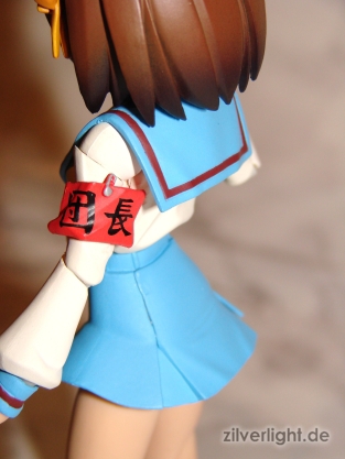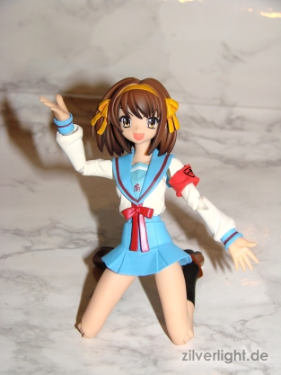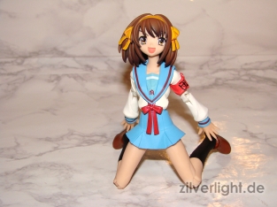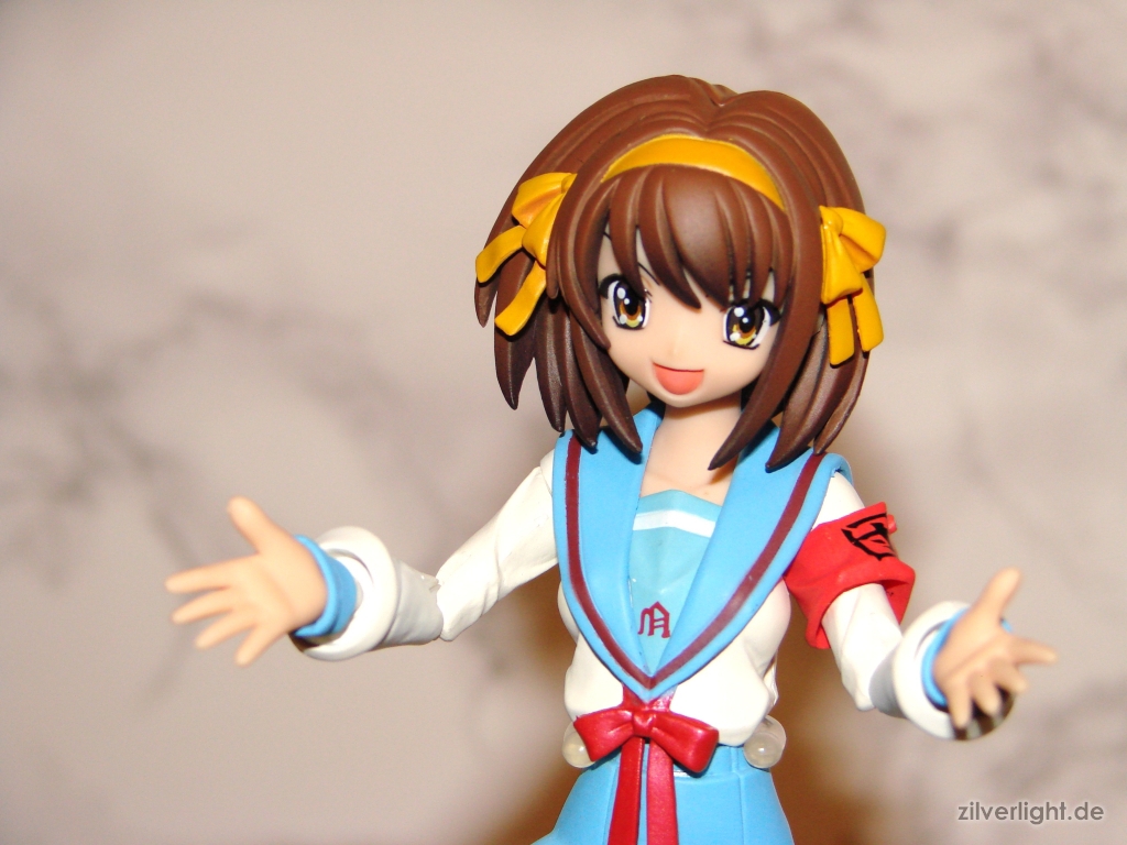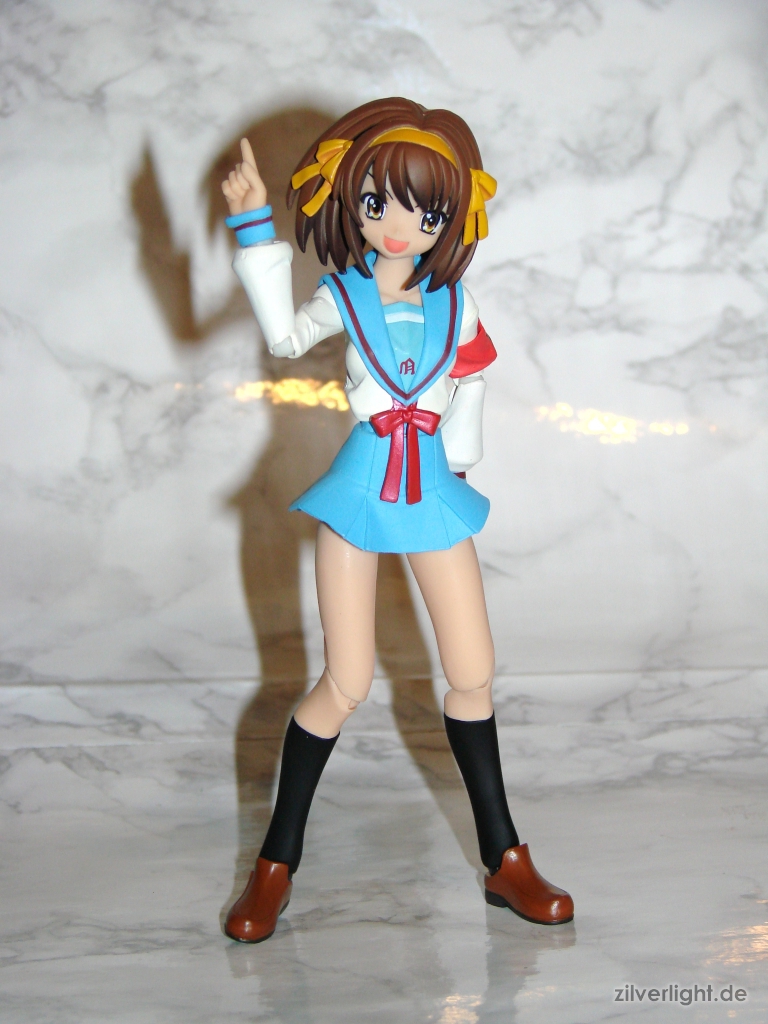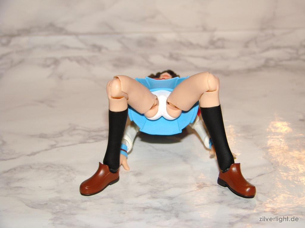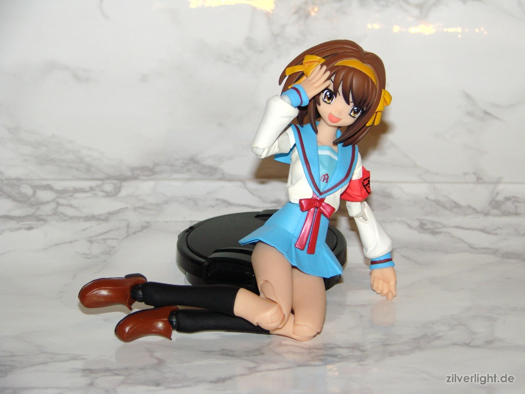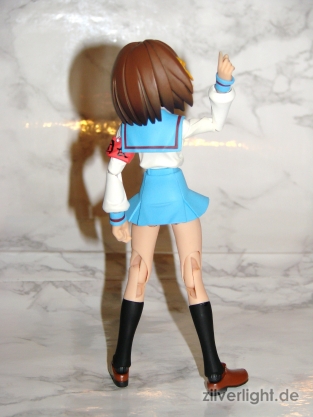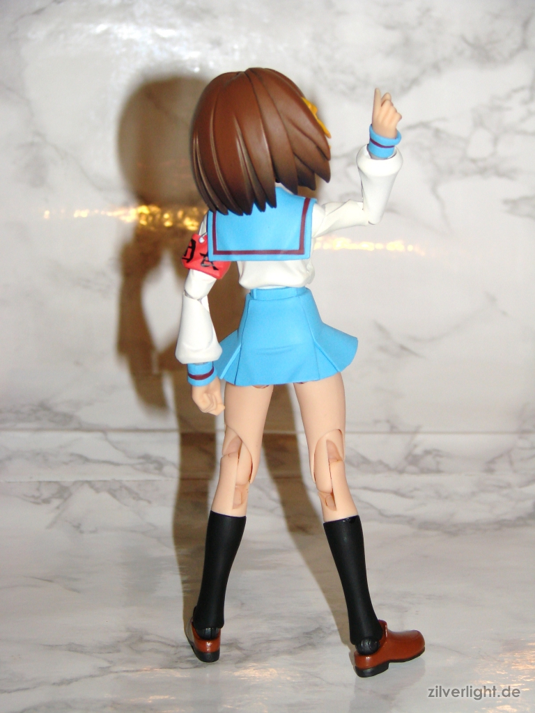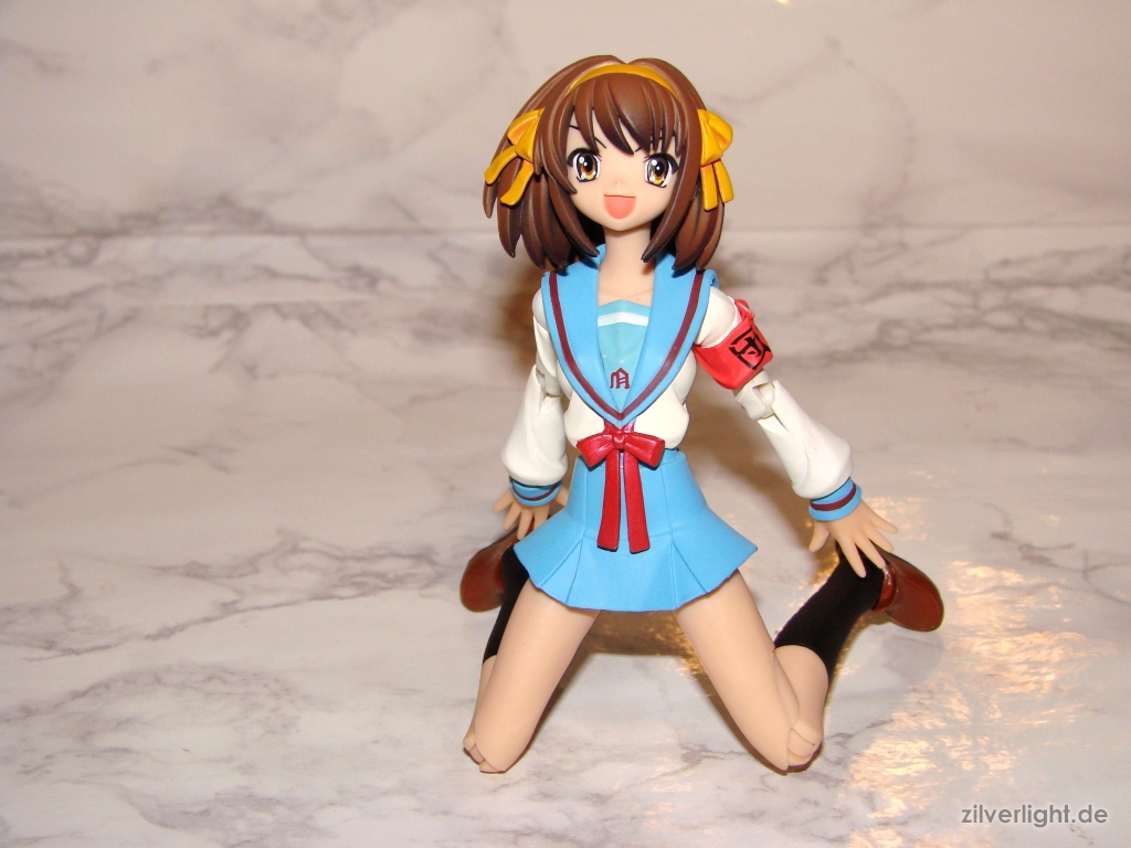 Revoltech-Figuren haben den Ruf, dass sie im Gegensatz zu Max Factorys Figma-Reihe um einiges robuster sind, dadurch allerdings optisch nicht ganz so schick wie Figmas. Insgesamt sieht die Revoltech Haruhi jedoch sehr ansehnlich aus und ich würde sogar fast behaupten, dass sie mir optisch in einigen Posen sogar etwas besser als ihr Figma-Konterpart gefällt. Die Gelenke sind bei der Revoltech variante allerdings nicht ganz so schön versteckt wie bei den Figmas.