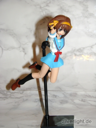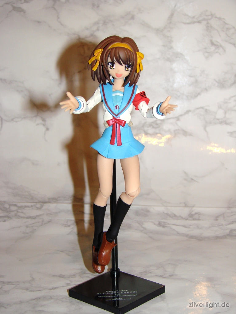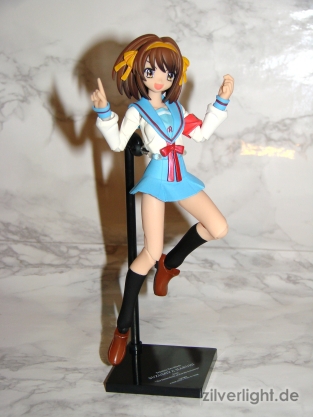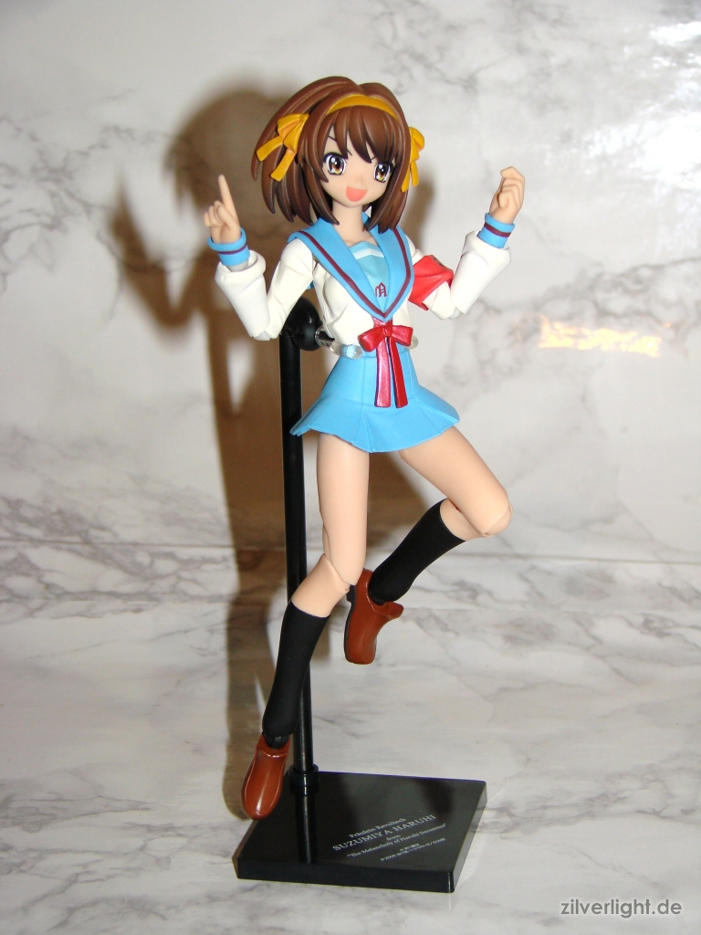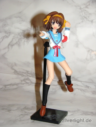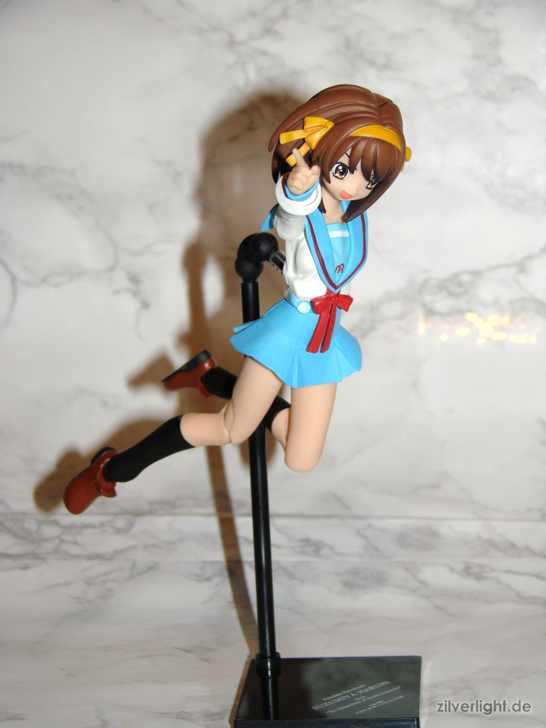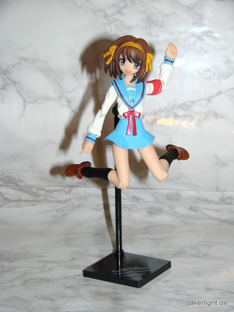 Die Base ist nicht sonderlich zufriedenstellend. So kann Haruhi nicht in simpler stehender Pose ausgestellt werden, da Haruhi durch die Befestigung wenige Millimeter vom Boden schwebt. Man kann zwar die Halterung nach oben und unten drehen, allerdings ändert dies nichts daran, dass Haruhi keine Bodenhaftung hat. Sieht nicht sonderlich schön aus muss ich sagen. Daher seht ihr auf meinen Bildern Haruhi meistens in springender Pose oder ähnlichem.