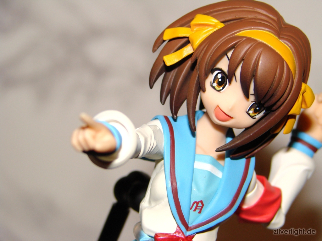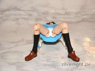 Die Bemalung ist bei Haruhi in Ordnung allerdings an manchen Stellen nicht sonderlich sauber, zumindest das weiss der Uniform hat ein paar bläuliche Flecken. Das Posing stellt sich nicht ganz so schön dar. Es war teilweise wirklich etwas Geduldarbeit um Haruhi in gewisse Posen zu bringen. Vorallem da die Ärme im sekundentakt immer wieder abgefallen sind. In diesem Punkt sind mir Figmas lieber. Dabei hat die Base ebenfalls weniger geholfen aber mehr dazu unten.