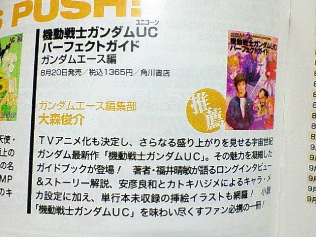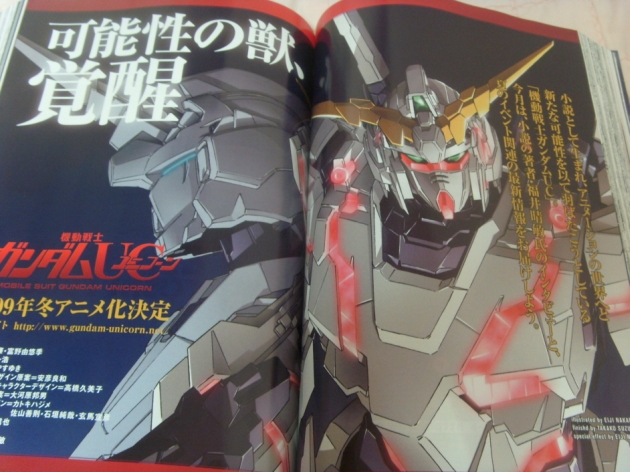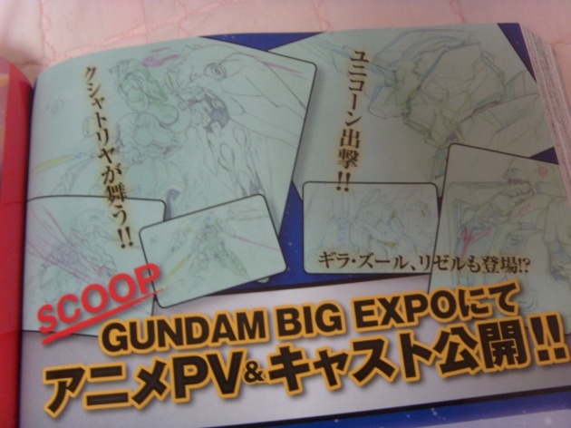 Nun was gibt es sonst noch? Magazine sind sich ebenfalls nicht einig, entweder wird von einem Film gesprochen oder wie im Beispiel hier unten eine TV Serie ankündigt. Der Film dürfte wohl aus dem Rennen sein, nachdem wir den oberen Screencap gesehen haben, außer man plant sowohl einen Film als auch eine Serie/OVA. Sozusagen in ähnlicher Form wie damals der F91 Film zumindest den Anfang der Serie angerissen hatte, man dann allerdings keine Crossbone Serie/OVA danach spendiert bekam. So könnte es so sein, dass man das Filmformat für die Anfänge “Day of the Unicorn” verwendet und die Serie/OVA den Rest erzählen lässt. Mehr als Spekulation ist das zum jetzigen Zeitpunkt nicht (und das wird es bis zum 22.August ohnehin wohl bleiben), aber mit dieser Erklärung würde man zumindest den angeblich angekündigten Film als auch eine Serie/OVA unterbringen die ebenfalls von Magazinen “bestätigt” werden.