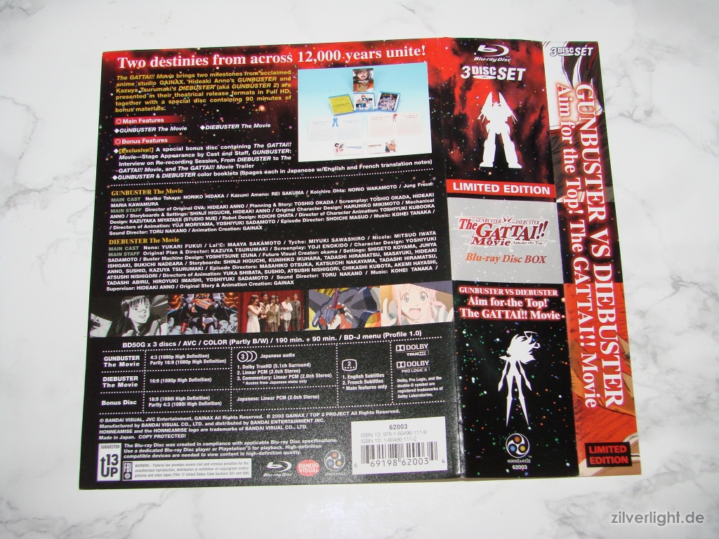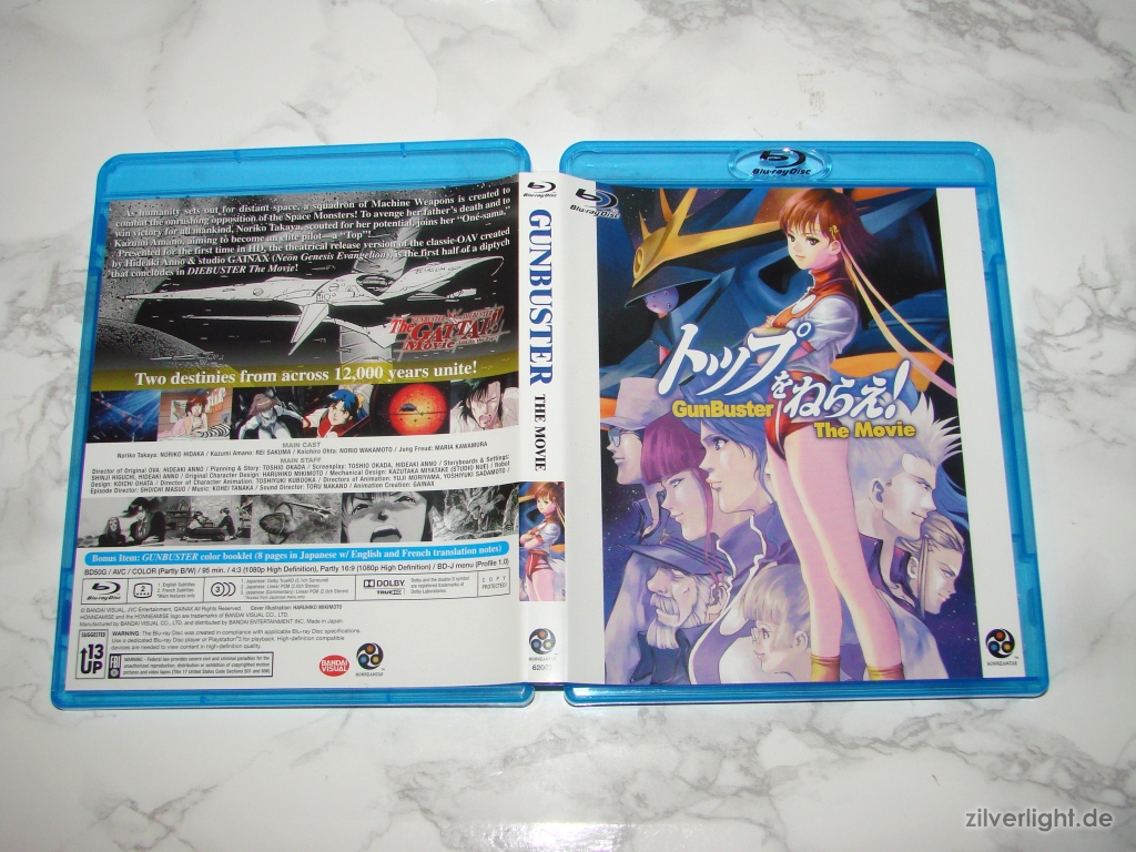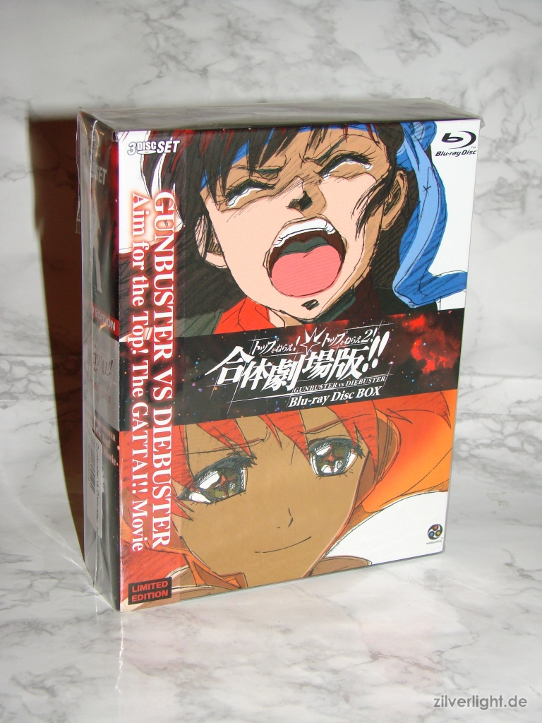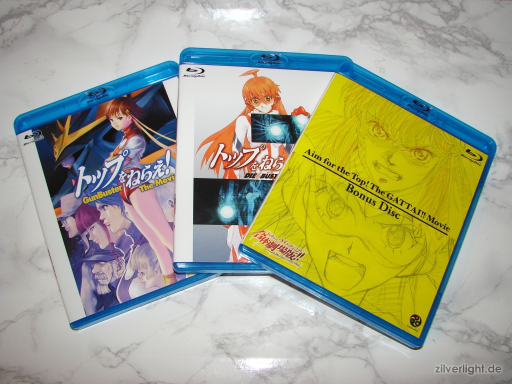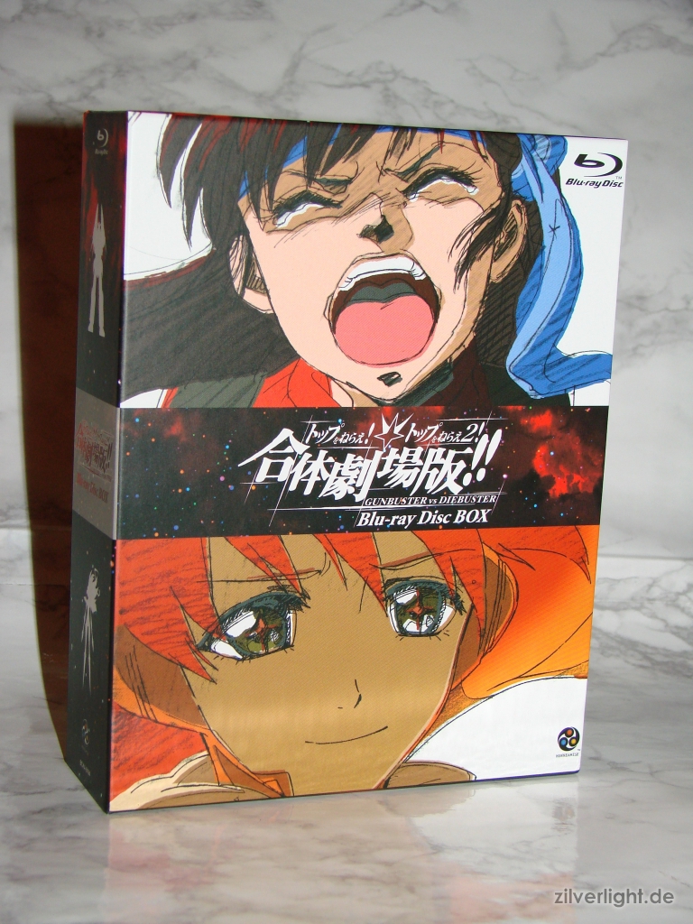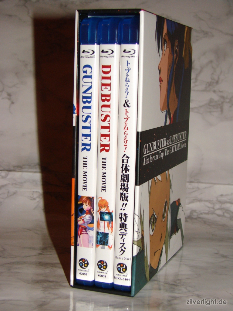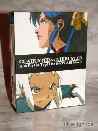 Inhalt der Blu-ray Box sind die Einzel-BDs zum Gunbuster und Diebuster Film, welche man in dieser Form auch einzeln kaufen kann. Der Vorteil der Blu-ray Box ist neben dem schicken Sammelschuber auch eine Bonus Blu-ray Disc mit Zusatzmaterial.