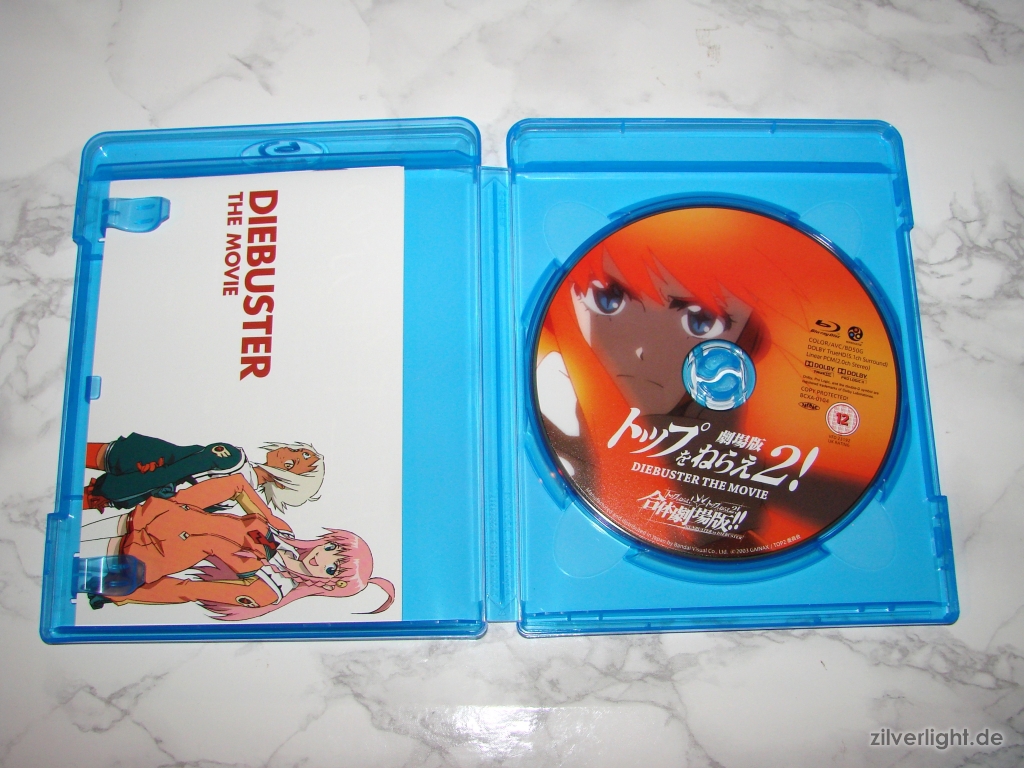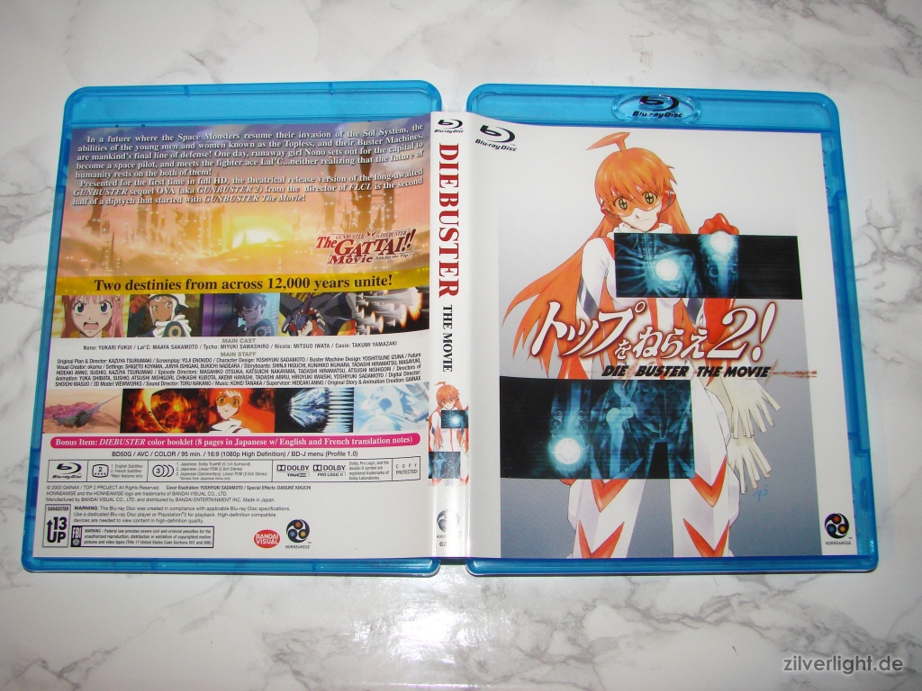 Der Diebuster Film liegt selbstverständlich auch in 1080p vor und ist selbstverständlich vollkommen in 16:9 Bildformat. Ansonsten sind die selben Arten von Audiospuren und Untertitel wie beim Gunbuster Film enthalten, also nur japanische Tonspuren mit englischen oder französischen Untertiteln.