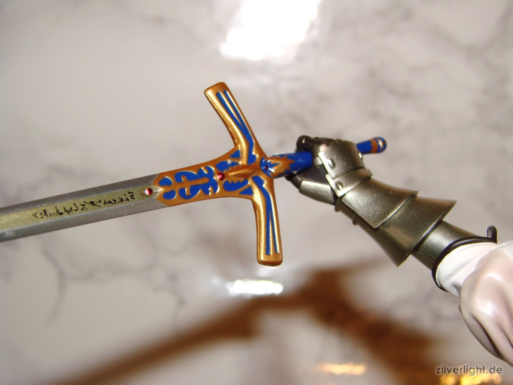 Beginnen wir indem wir Saber Excalibur in die Hand drücken. Excalibur lässt sich nicht wie Caliburn einfach in das Loch der greifenden Hand stecken, sondern es muss zuerst der untere goldene Teil von Excalibur abgezogen werden bevor man es in Sabers Hand stecken kann.