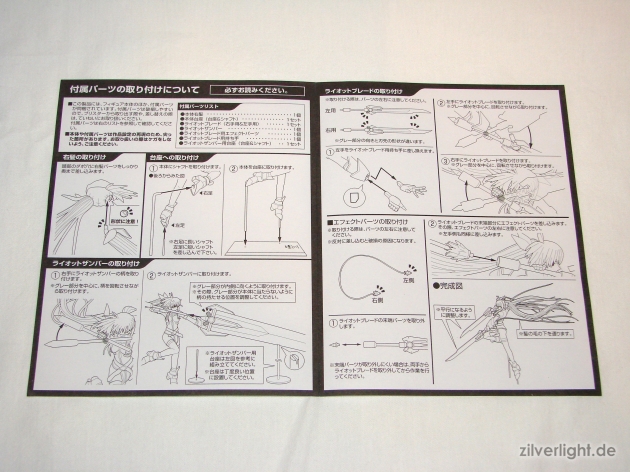 Fate kommt mit einer recht großen (im Vergleich zu anderen) Anleitung daher in welcher sämtliches genau dokumentiert ist. So wird neben dem Befestigen eines ihrer Twintails und der Befestigung an der Base ebenfalls gezeigt wie die Schwerter in ihre Hand gelegt werden müssen. Außerdem liegt Fate noch eine offene Zusatzhand bei, welche zusammen mit dem Zanber verwendet wird, da Fate hierbei nur eine Hand zum Halten benötigt.