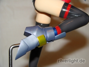 Befestigt wird Fate mithilfe von zwei Eisenstangen, die auf der Unterseite ihrer Füße eingesteckt werden und einen insgesamt sehr stabilen Eindruck machen, an der Base. Daneben könnt ihr die beiliegenden Waffen und ihre jeweiligen Griffe sehen.