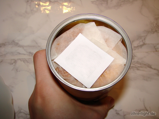 Sobald man den Deckel entfernt hat sehen wir etwas verpacktes und darauf ein kleines weißes Päckchen liegen. Nein, das ist nicht die optionale Zuckerglasur, sondern eines dieser praktischen Päckchen, genannt Oxygen Absorber, Hot Pack oder auch Warm pad. Diese werden im Lebensmittelbereich verwendet, wenn man Lebensmittel länger aufheben möchte (also sofern man das Brot nicht sofort verzehrt). Vorteile dieser Päckchen ist u.a. die Eliminierung von Mikroben, aber auch den eigentlichen Geschmack und Farbe des Lebensmittel hilft es zu bewahren und macht Konservierungsmittel (bei Lebensmittel in Dosen ohnehin ^^) unnötig.